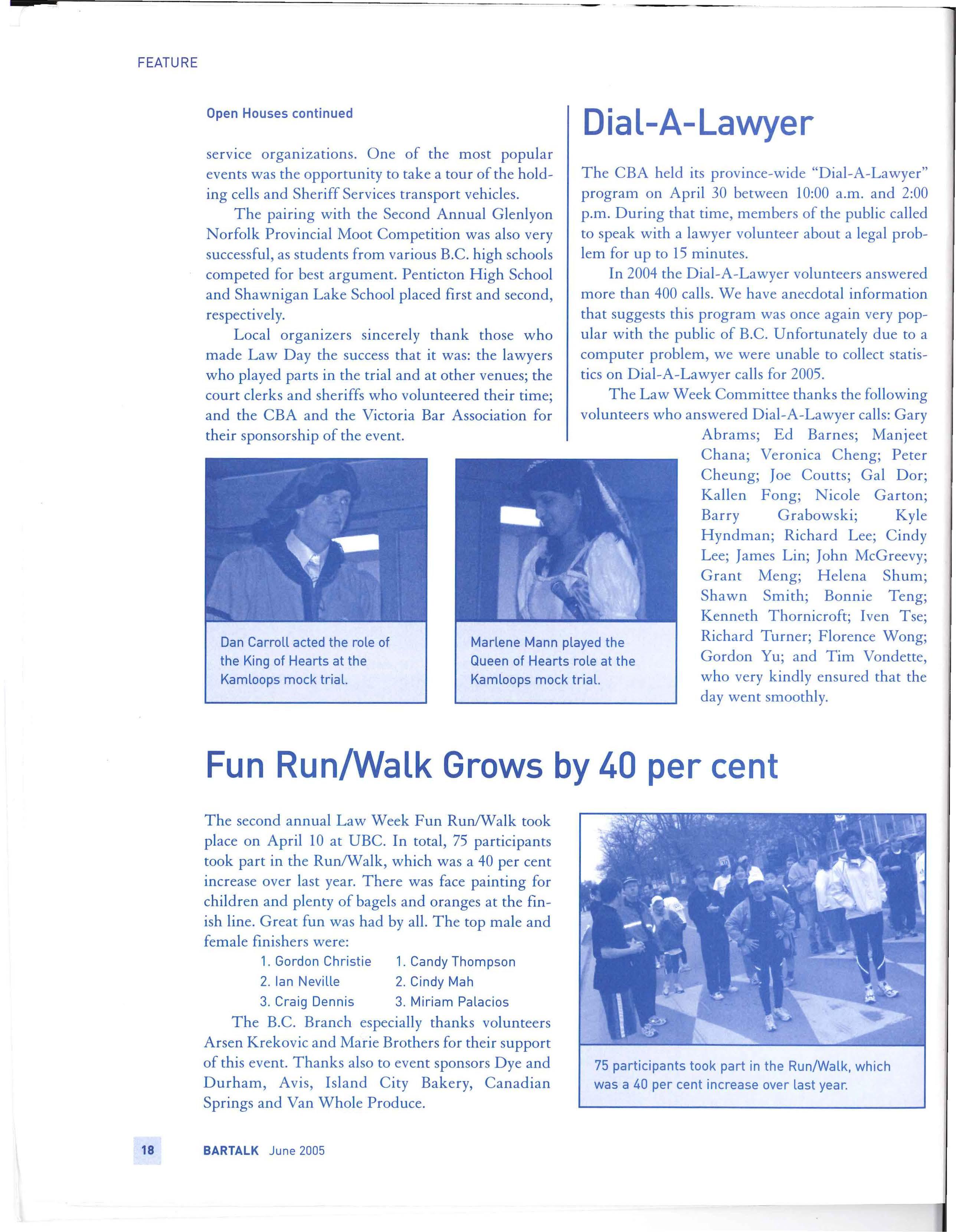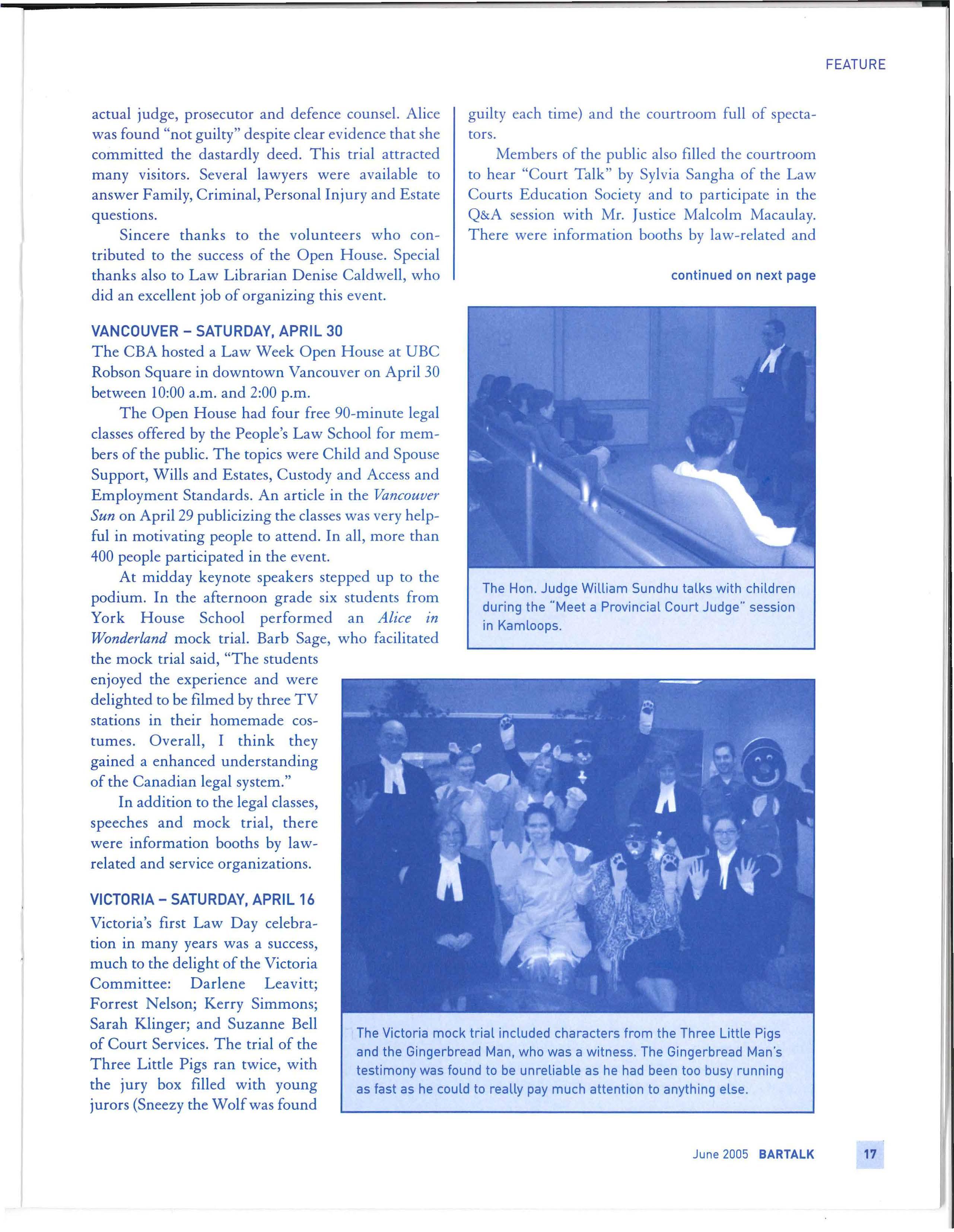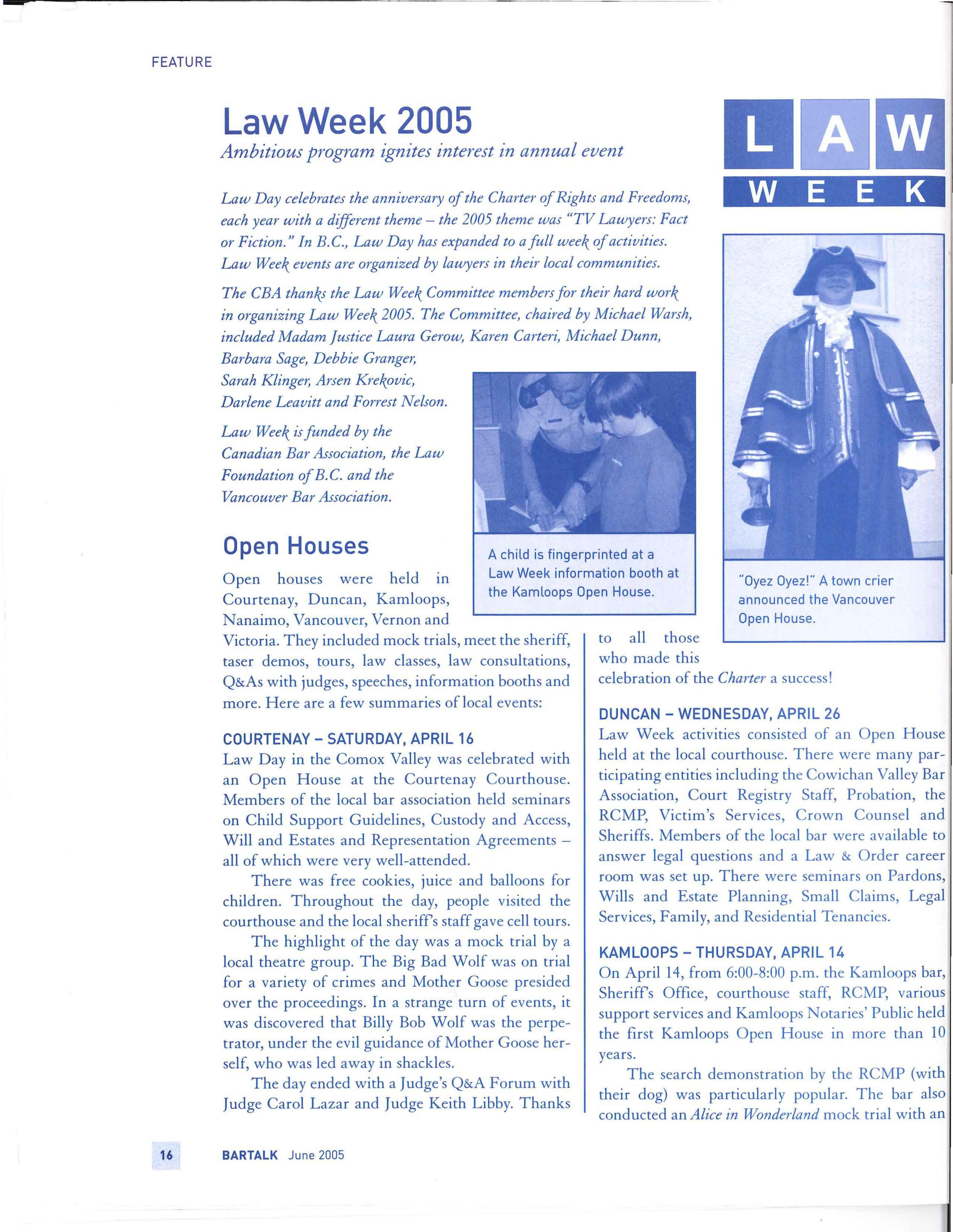 Law Week is our celebration of the anniversary of the Charter of Rights and Freedoms. It is also the one time during the year when the law rightly shifts into the spotlight. With a welcoming, knowledgeable presence we invited th e public into our local courthouses to watch mock trials, consult with lawyers at information booths, take free legal classes and learn about rights due to all Canadians.