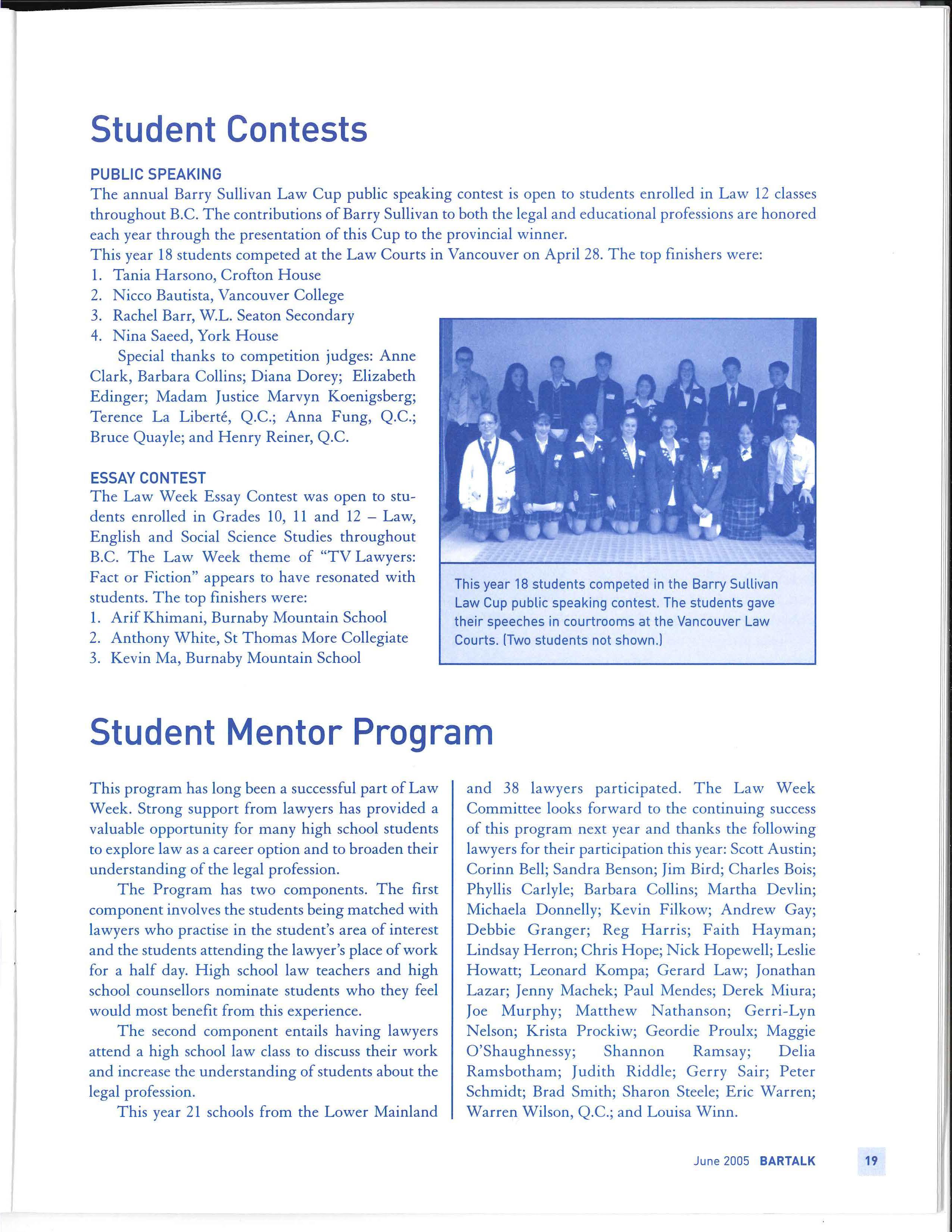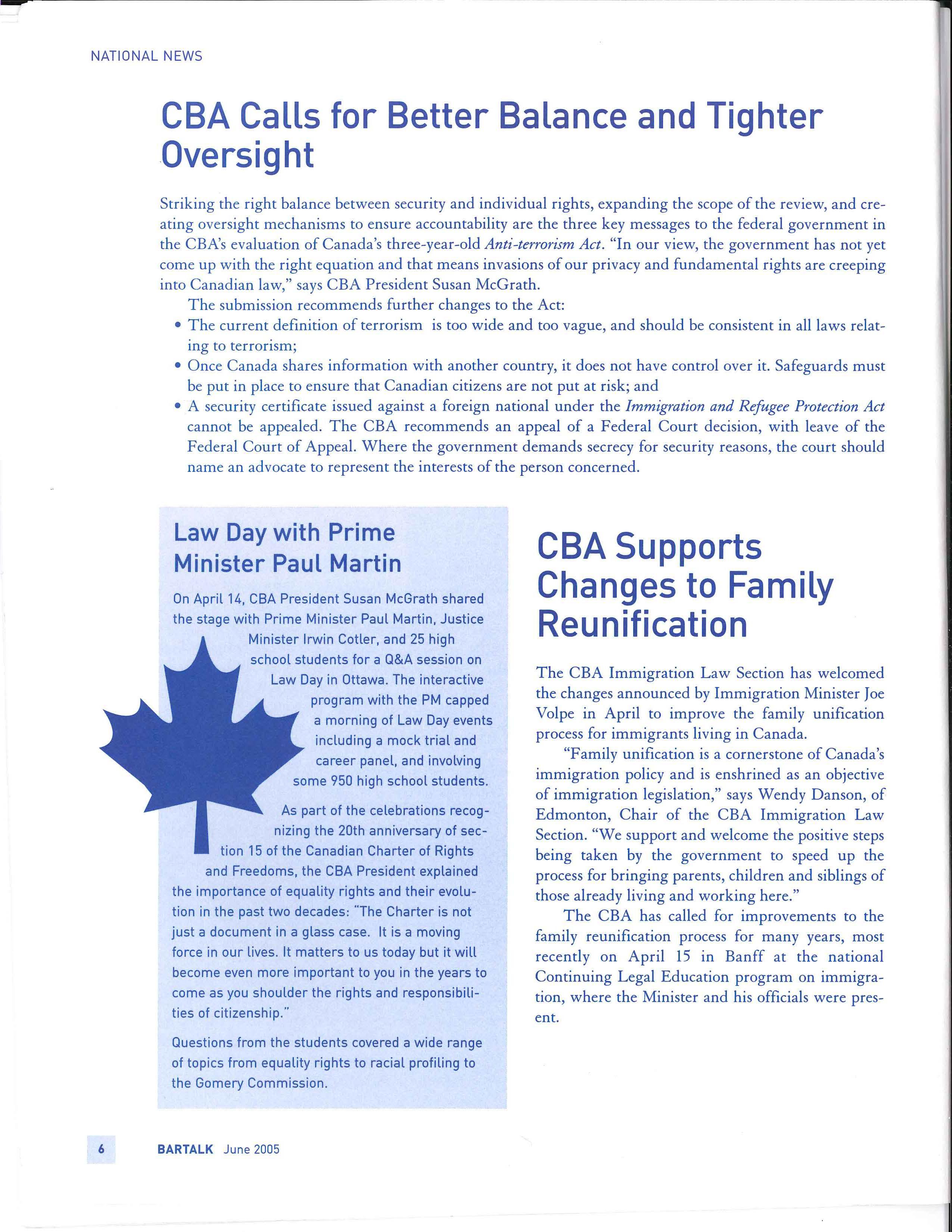 On April 14, CBA President Susan McGrath shared the stage with Prime Min ister Paul Martin, Justice Minister Irwin Cotler, and 25 high sc hoo l students fo r a Q&A session on Law Day in Ottawa. The i nteractive program with the PM capped a morning of Law Day events including a mock trial and career panel, and involving some 950 h i gh school students.