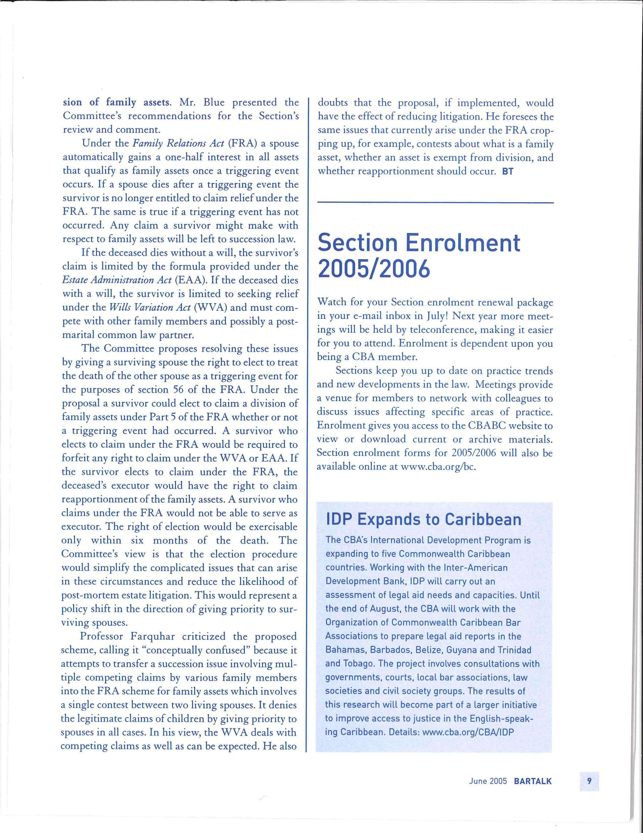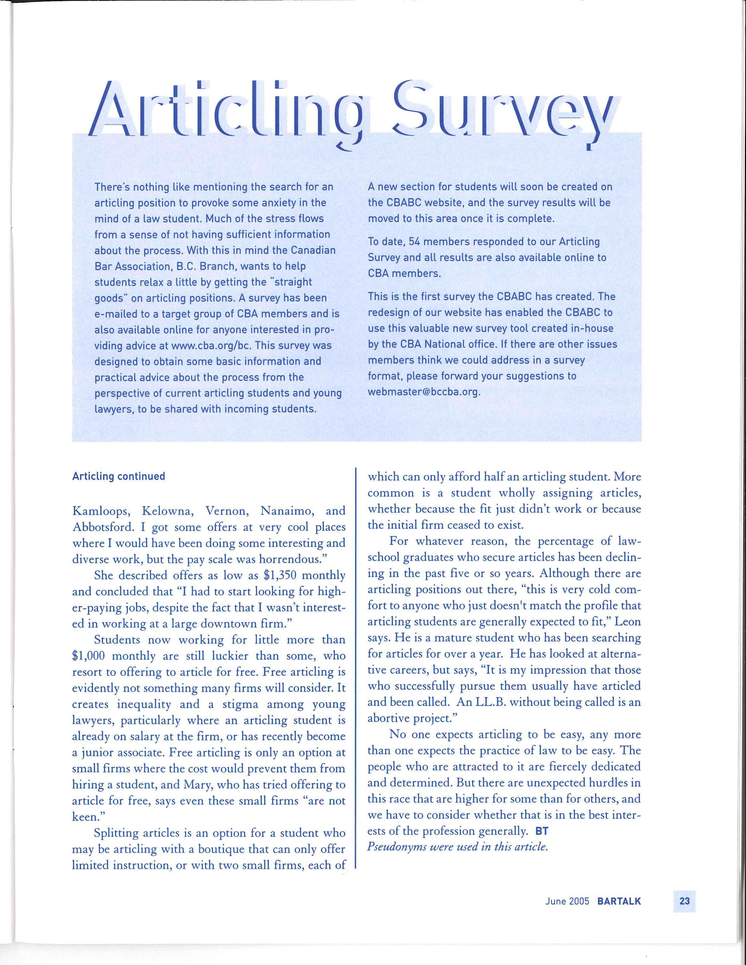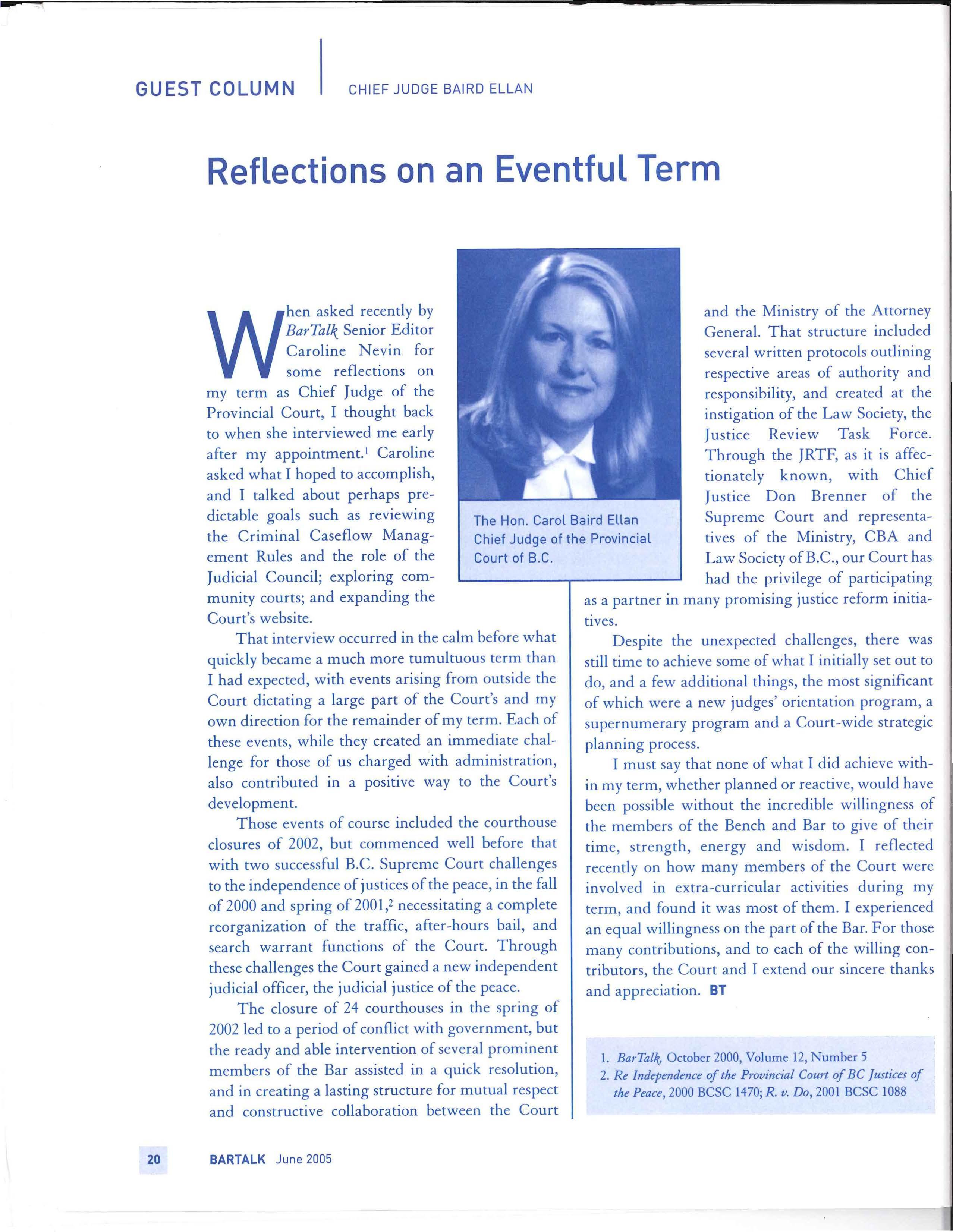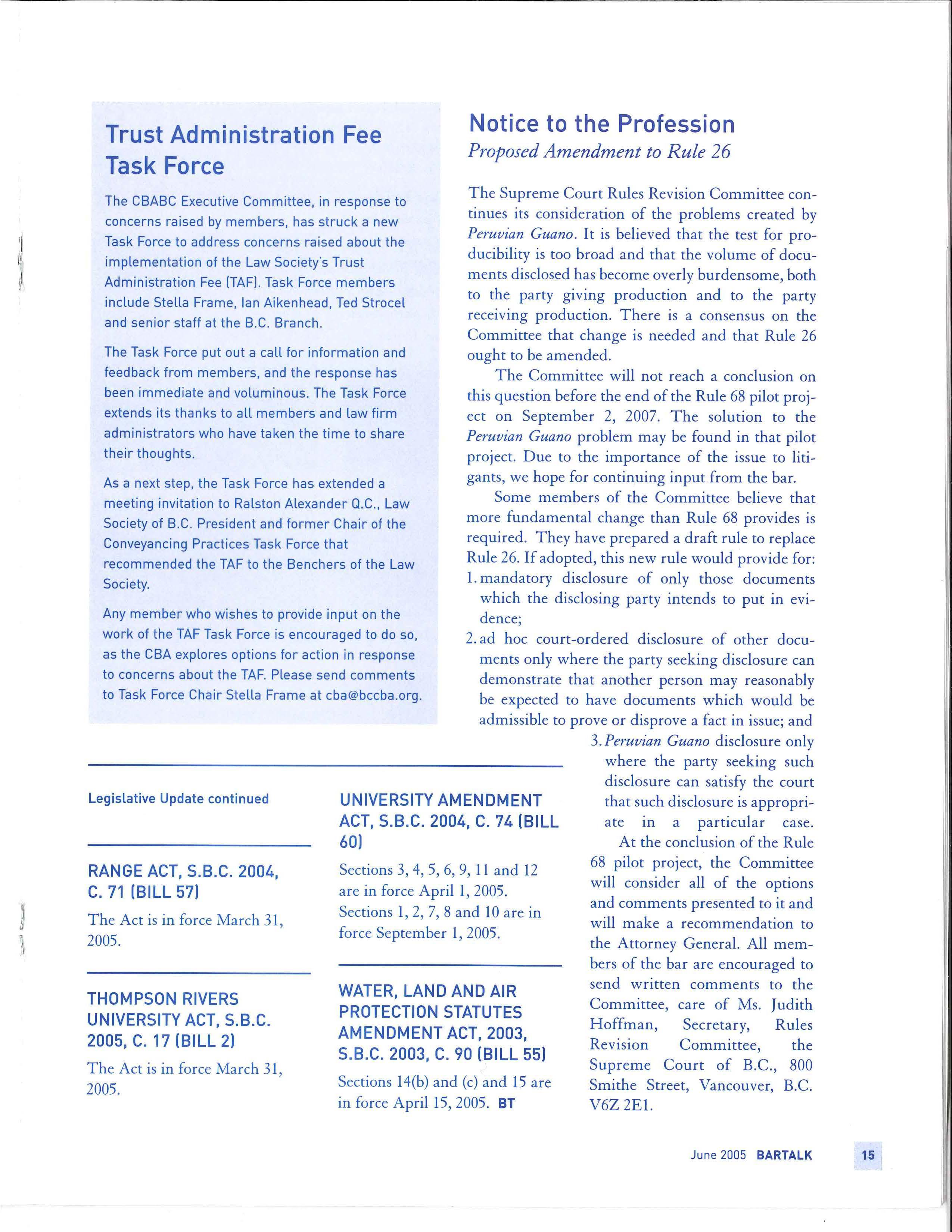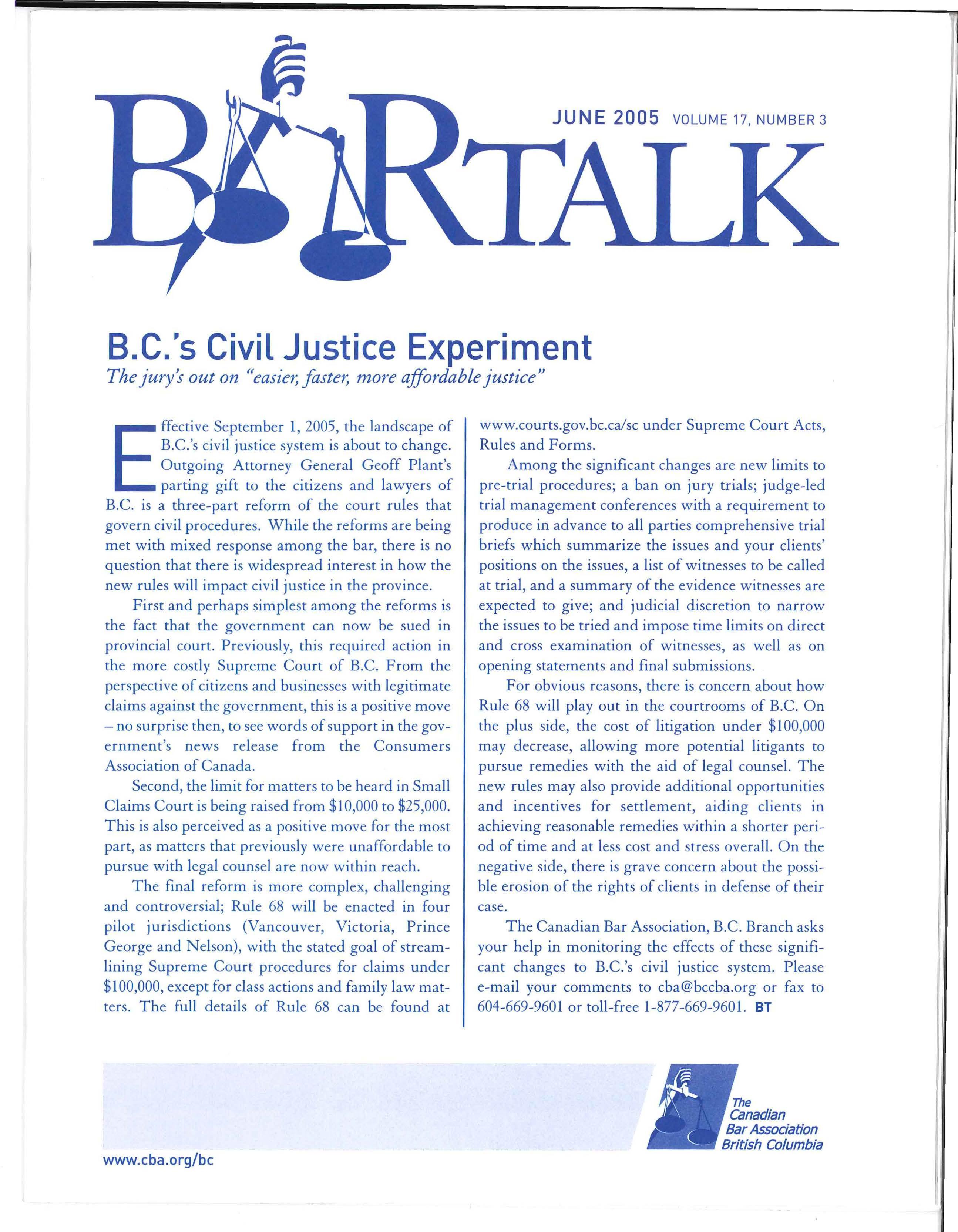 The Canadian Bar Association, B.C. Branch asks your help in monitoring the effects of these significant changes to B.C.'s civil justice system. Please e-mail your comments to cba@bccba.org or fax to 604-669-9601 or toll-free 1-877-669-9601. BT The Canadian Bar Association British Columbia