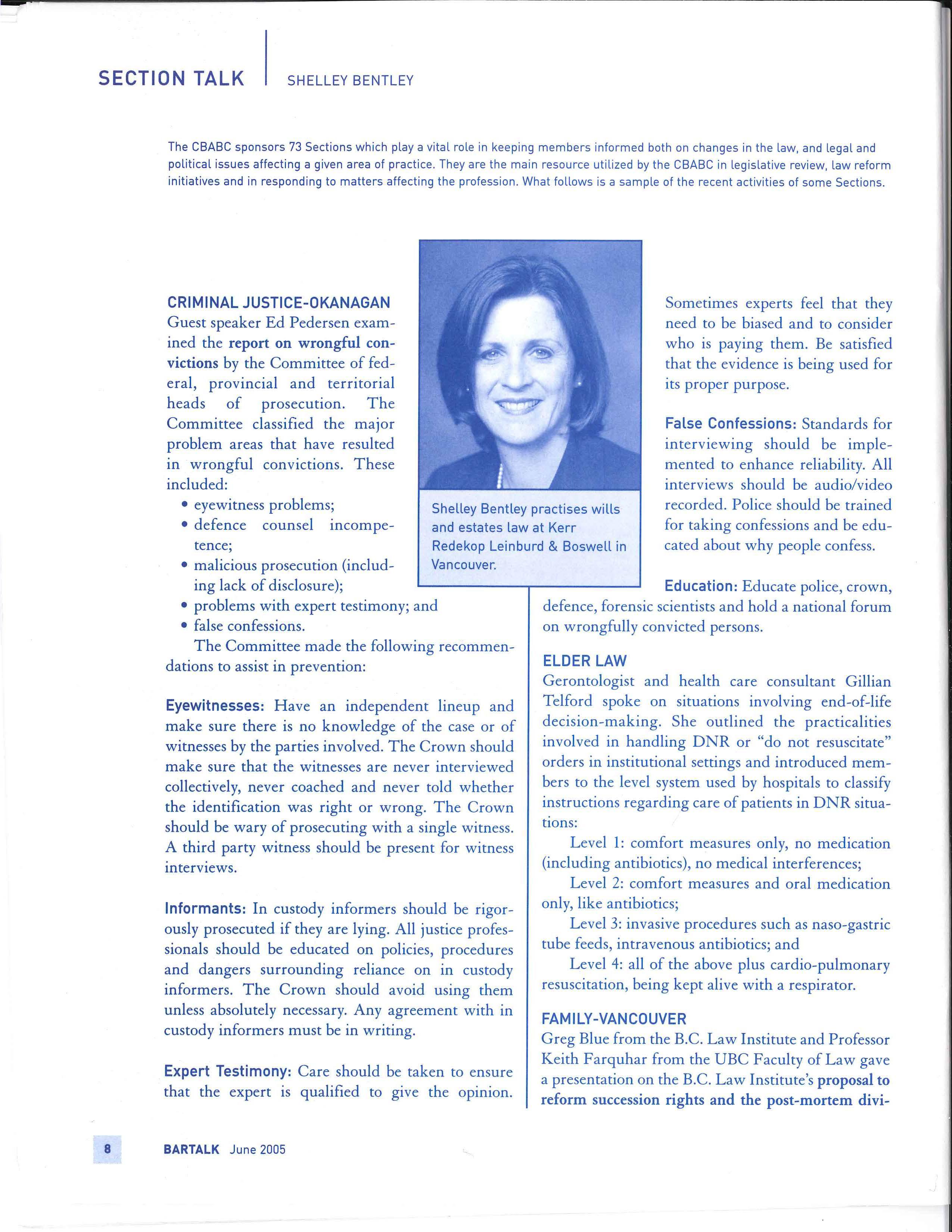 In my first year on the executive, I was pleased to have had the opportunity to work with Margaret Ostrowski, Q.C. (then Branch past president, and new Bencher) in thinking about and formalizing the structural options open under branch and national bylaws, and the "how to's" for those options Margaret was the first Chair of what was then an informal ad hoc group of senior women lawyers styled the "Women's Advisory Council. " In 2002 the executive discussed it in April, chose its recommended option, and presented it to Provincial Council in