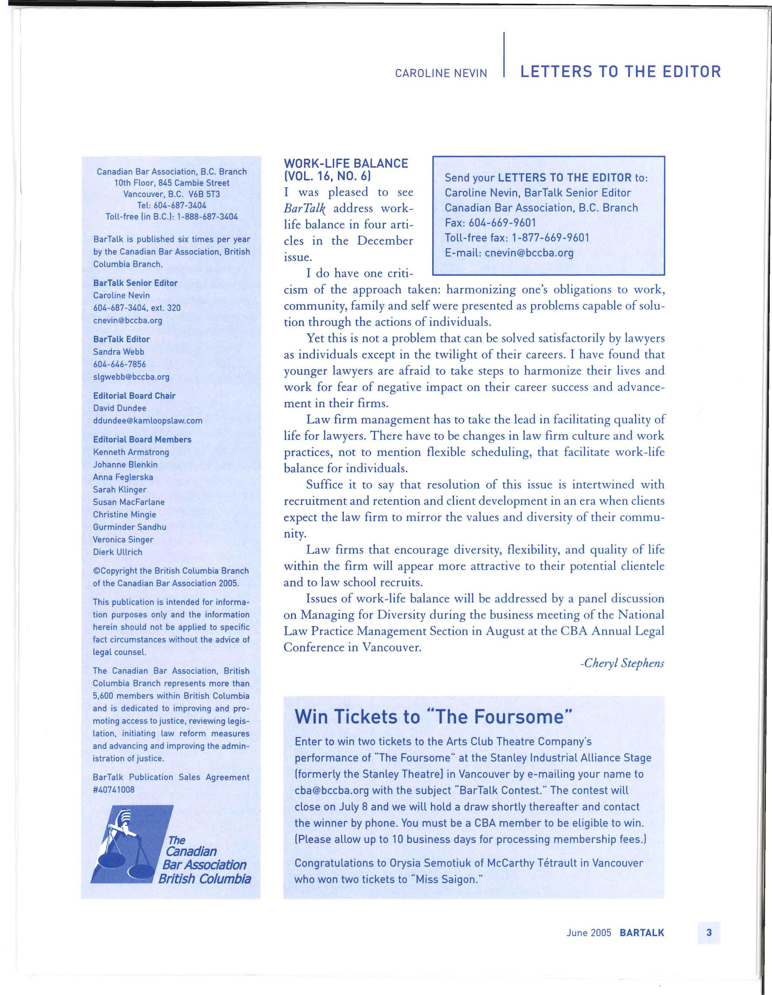 Send your LETTERS TO THE EDITOR to: Caroline Nevin, BarTalk Senior Editor
