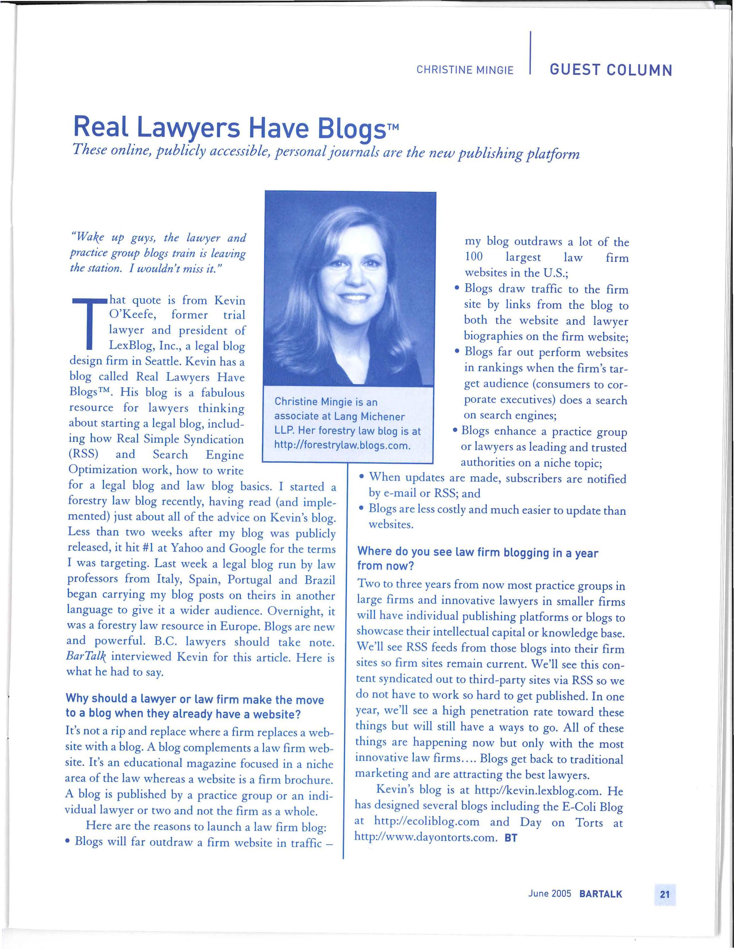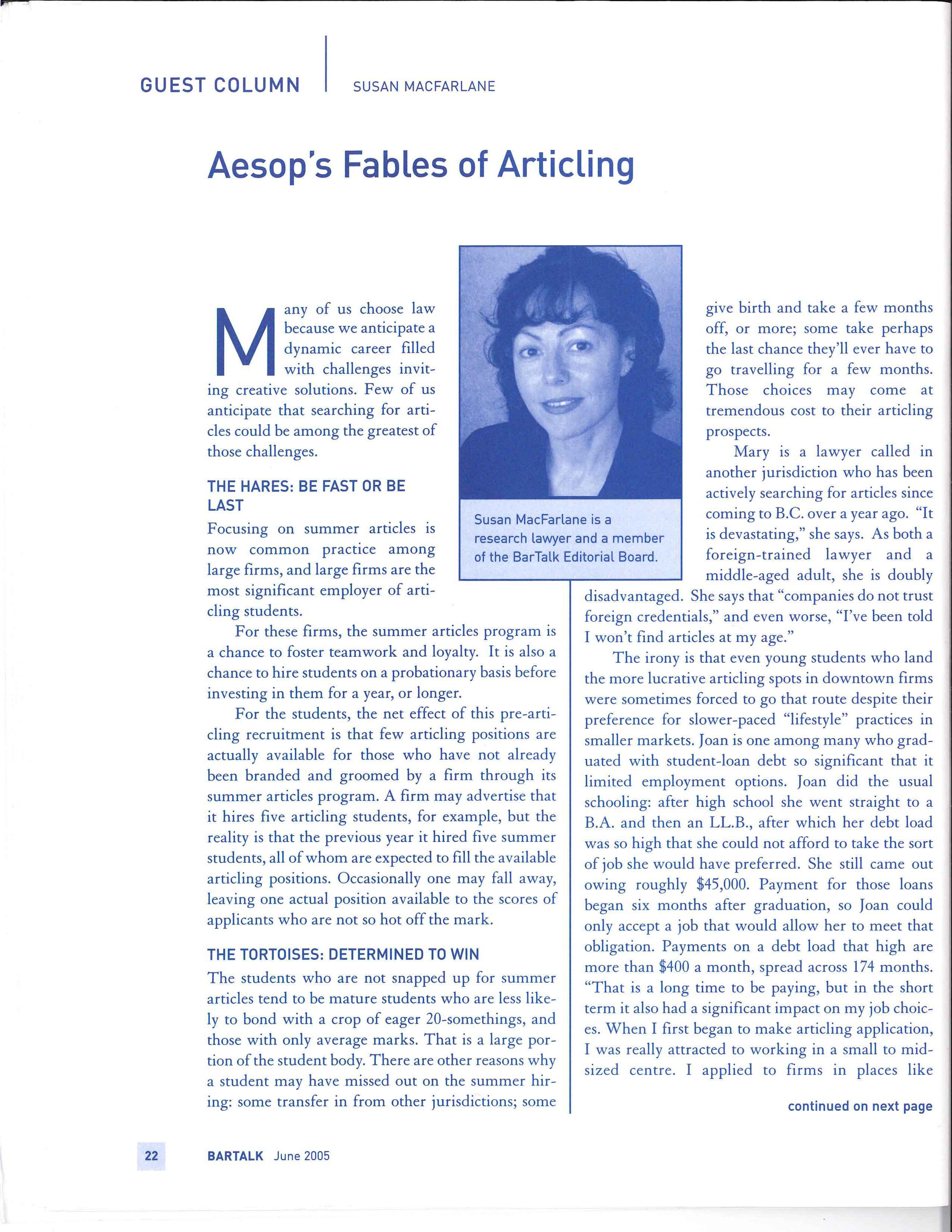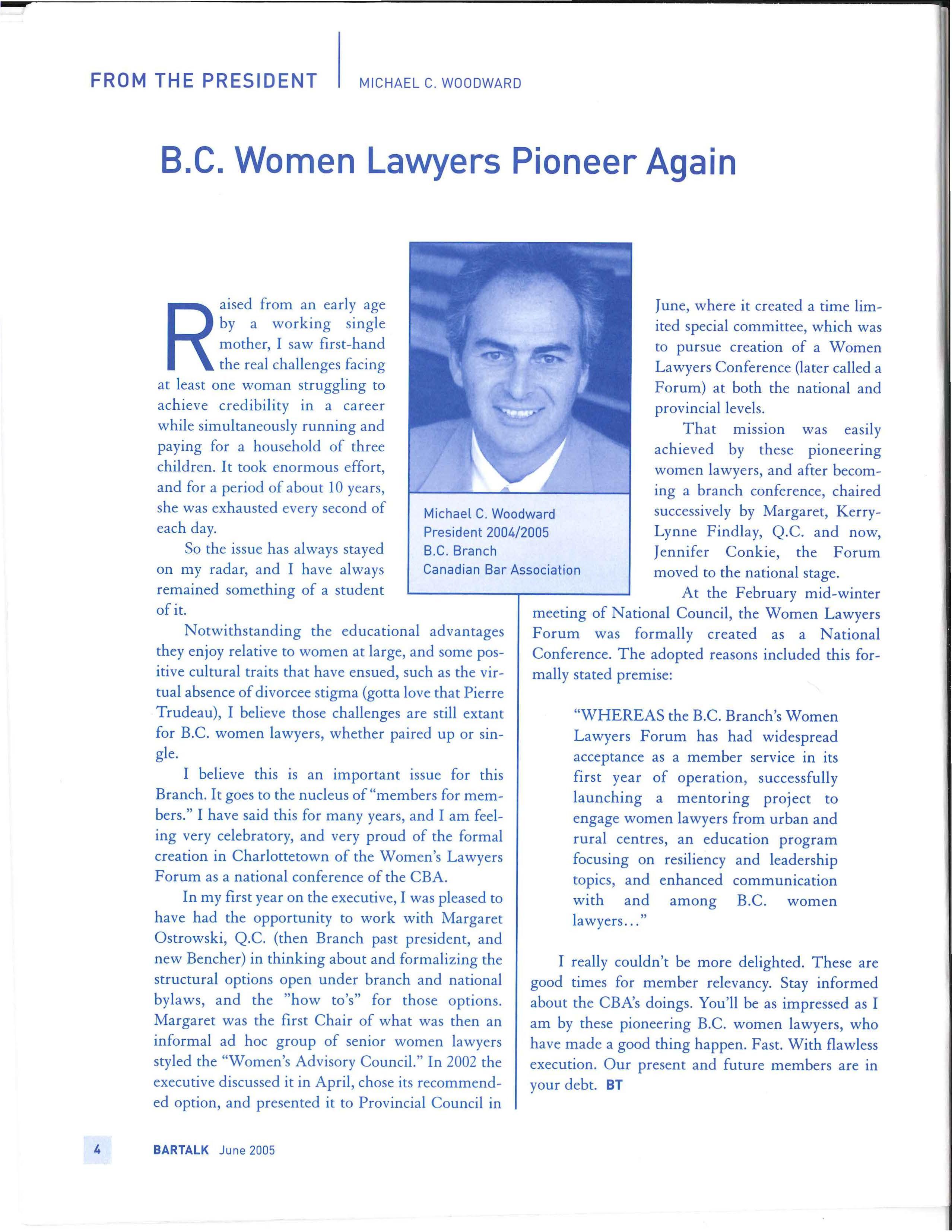 I rea ll y cou ldn't be more delighted These are good times for member relevan cy. Stay informed about the CBA's doings. You'll be as impressed as I am by these pioneering B.C women lawyers, who have made a good thing happen. Fast. With flawless execution. Our present and future members are in your debt . BT