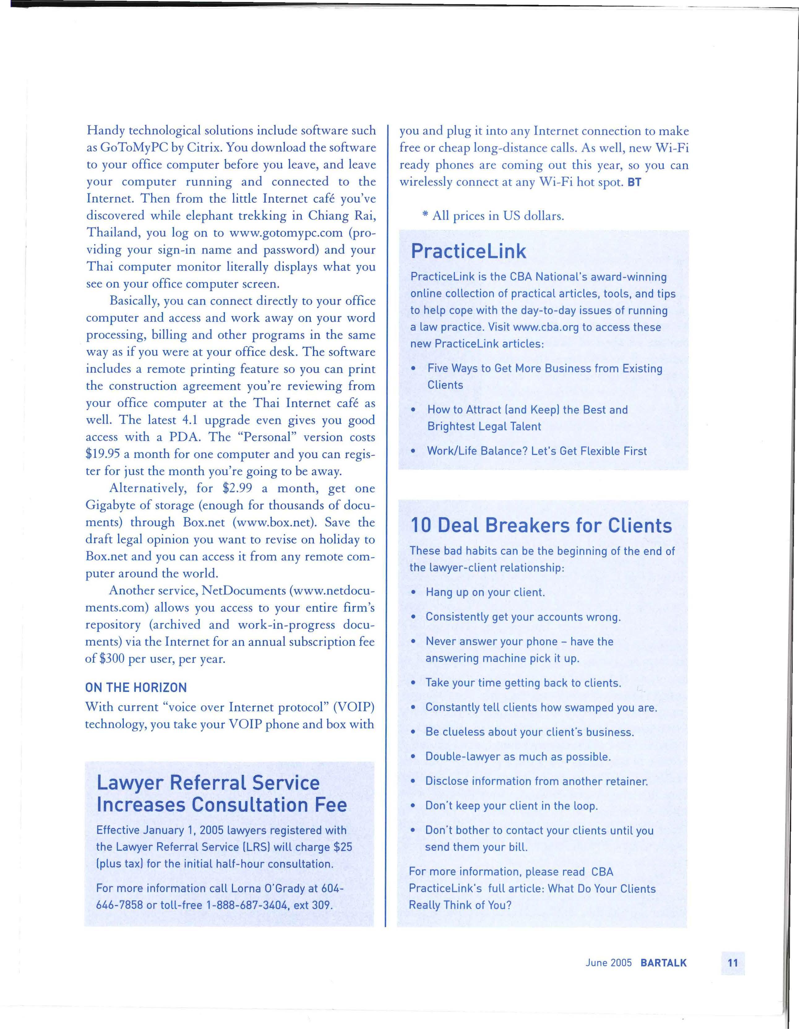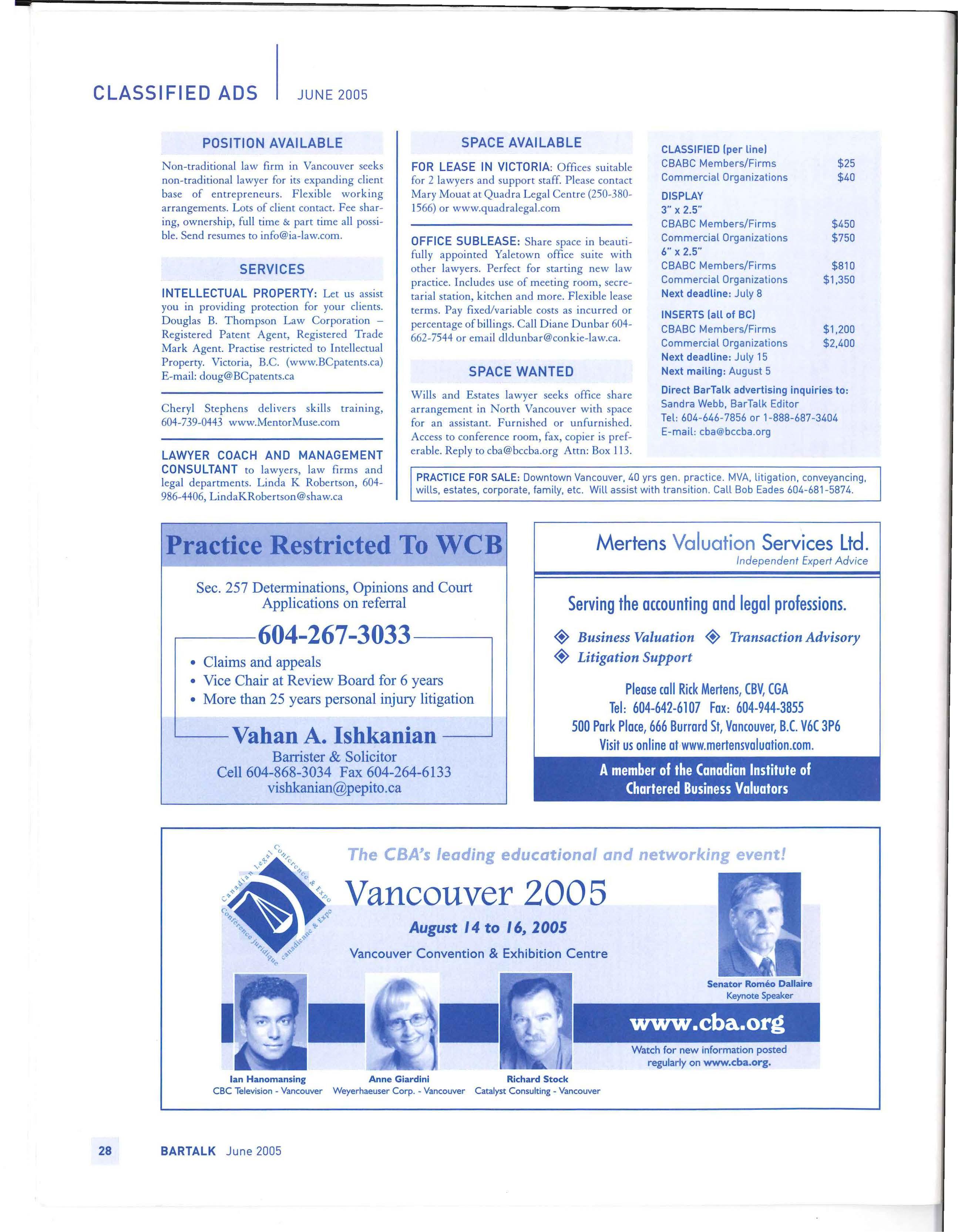 Direct BarTalk advertising inquiries to: Sandra Webb, BarTalk Editor Tel : 604-646-7856 o r 1-888-687-3404 E-mai l: c ba@bccba.o rg