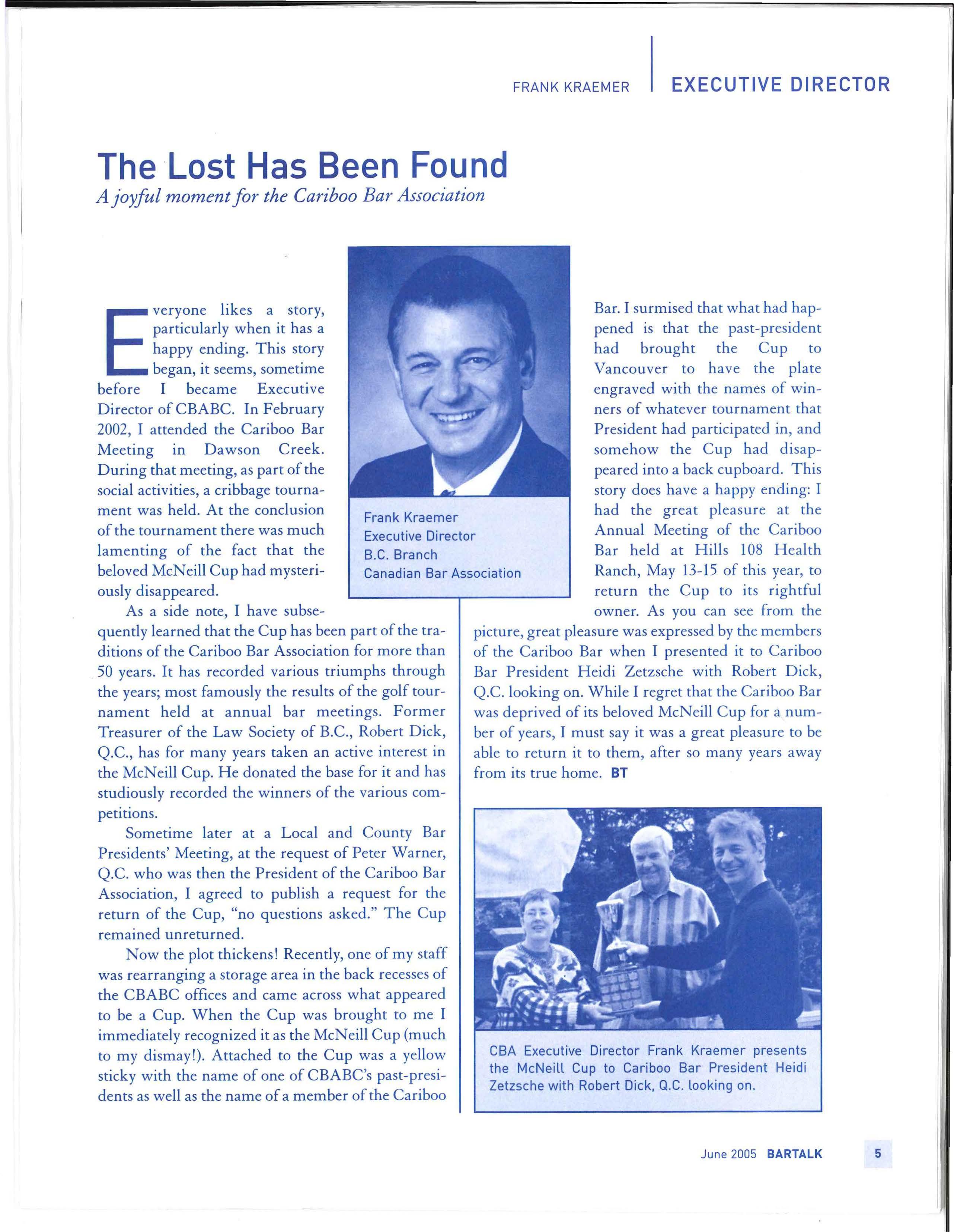 before I became Executive Director of CBABC. In February 2002, I attended the Cariboo Bar Meeting m Dawson Creek. During that meeting, as part of the social activities, a cribbage tournament was held. At the conclusion of the tournament there was much lamenting of the fact that the beloved McNeill Cup had mysteriously disappeared.