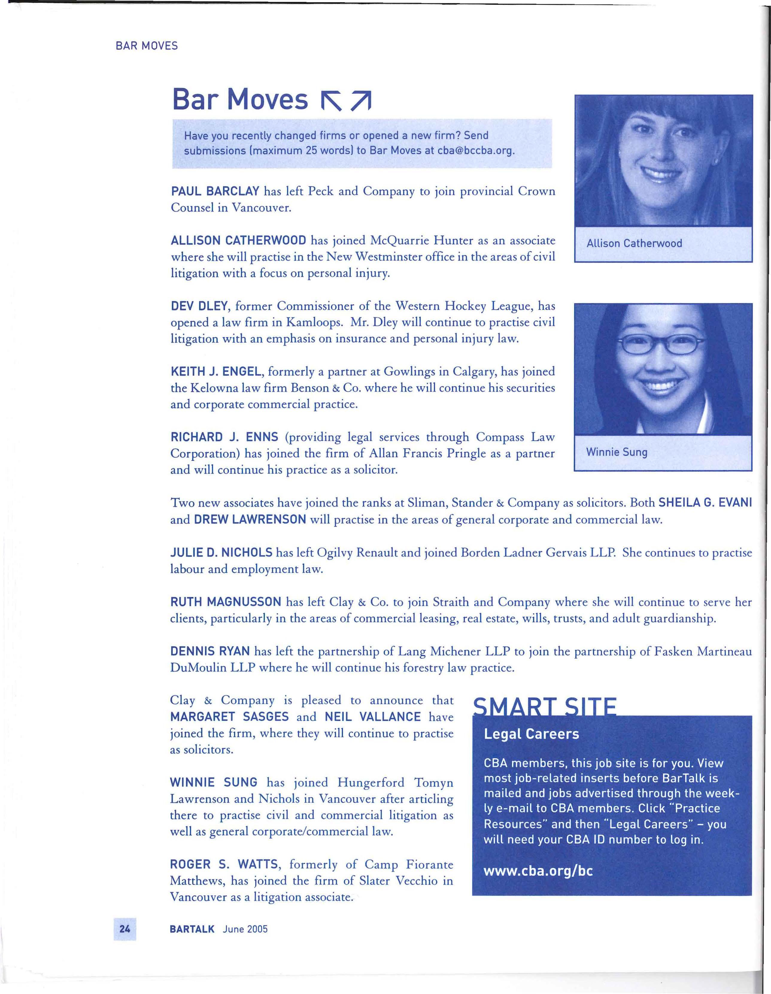 Have you recently changed firms or opened a new firm? Send submissions [maximum 25 words) to Bar Moves at cba@bccba.org