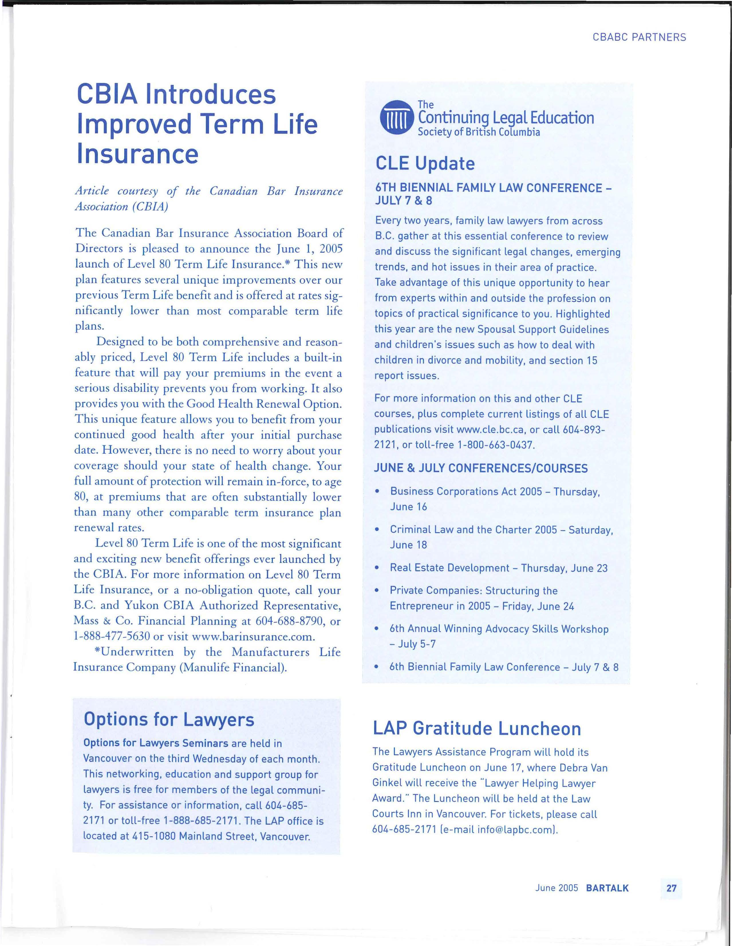The Canadian Bar Insurance Association Board of Directors is pleased to announce the June 1, 2005 launch of Level 80 Term Life Insurance.* This new plan features several unique improvements over our previous Term Life benefit and is offered at rates significantly l ower than most comparable term life plans