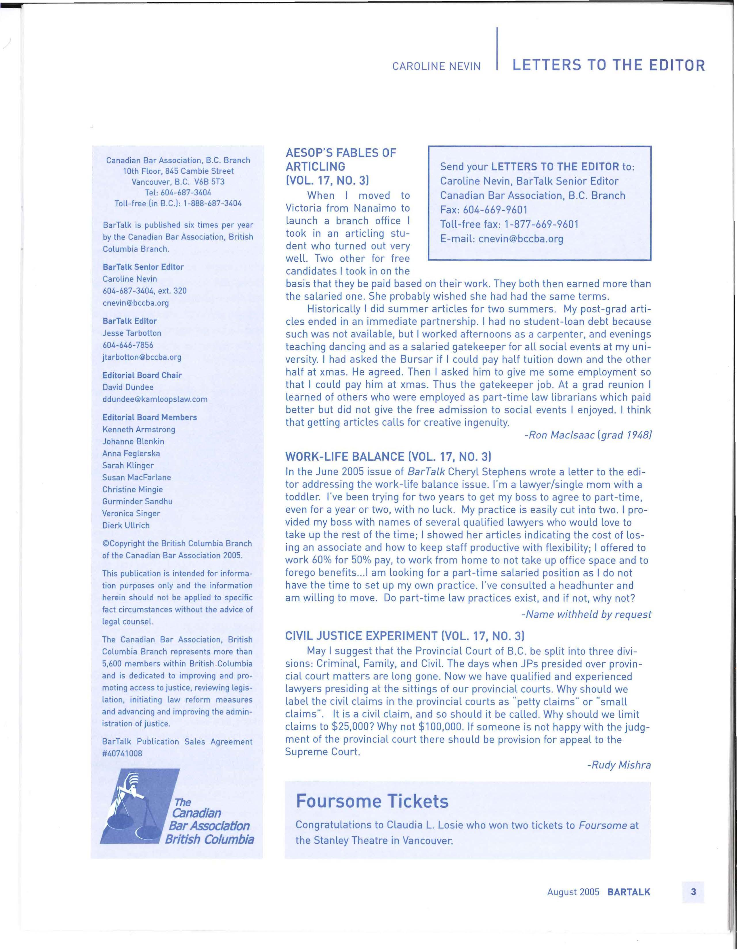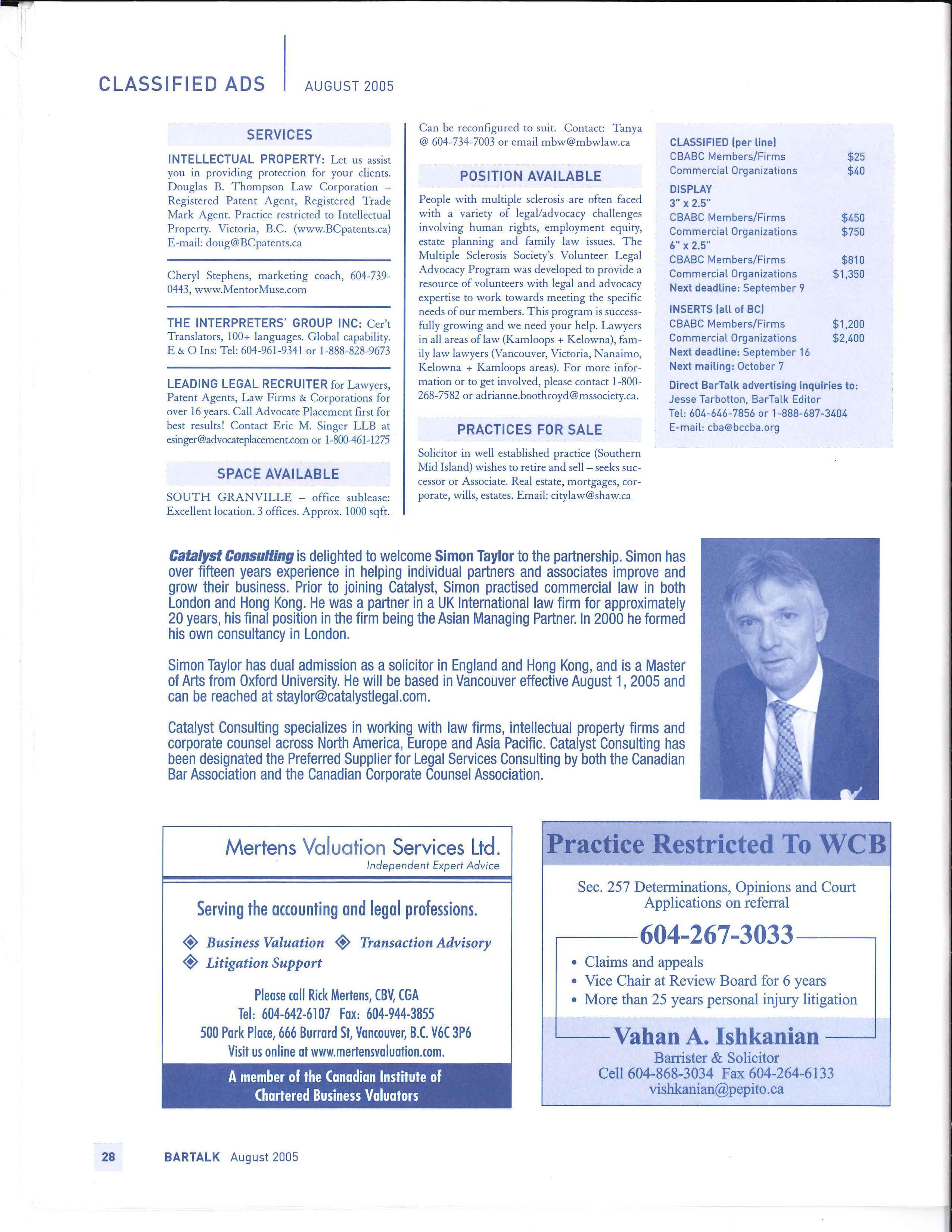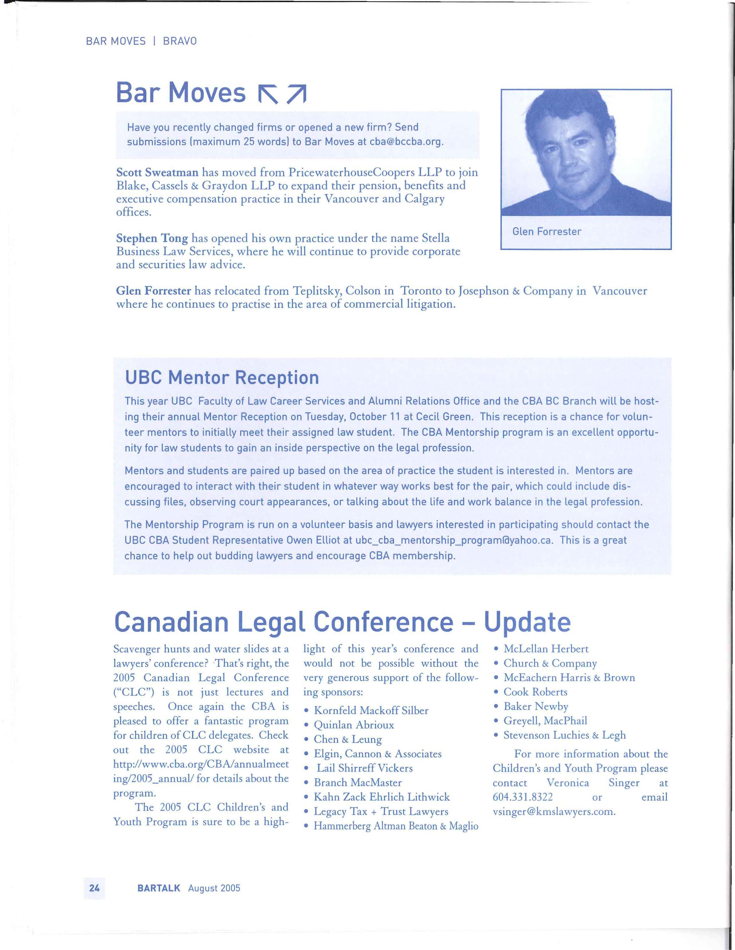 Direct BarTalk advertising inquiries to: Jesse Tarbotton, BarTalk Editor Tel: 604-646-7856 or 1-888-687-3404 E-mail: cba@bccba.org