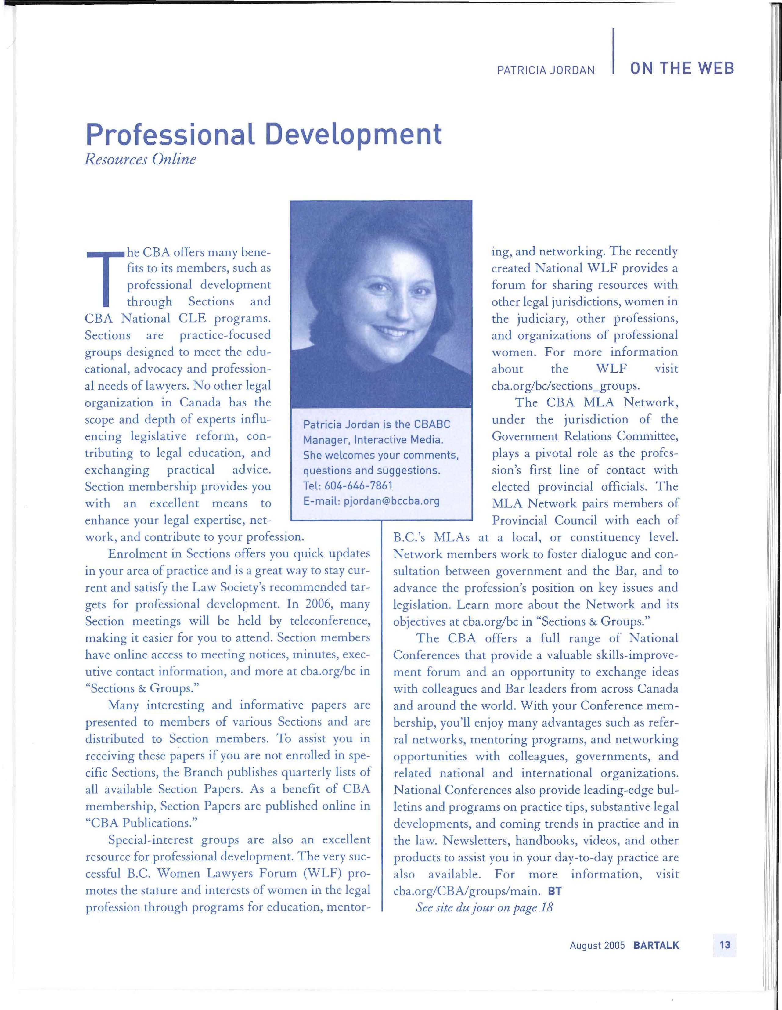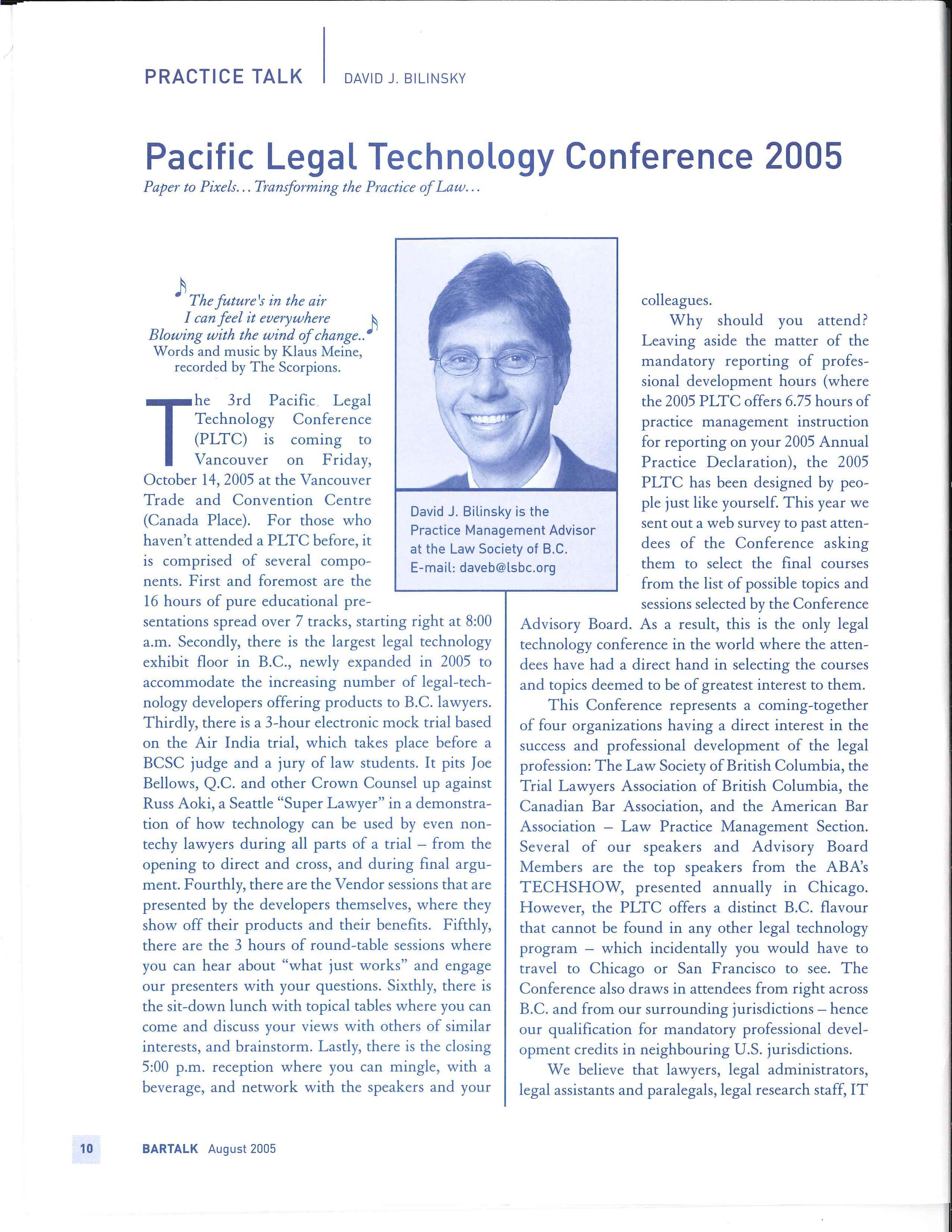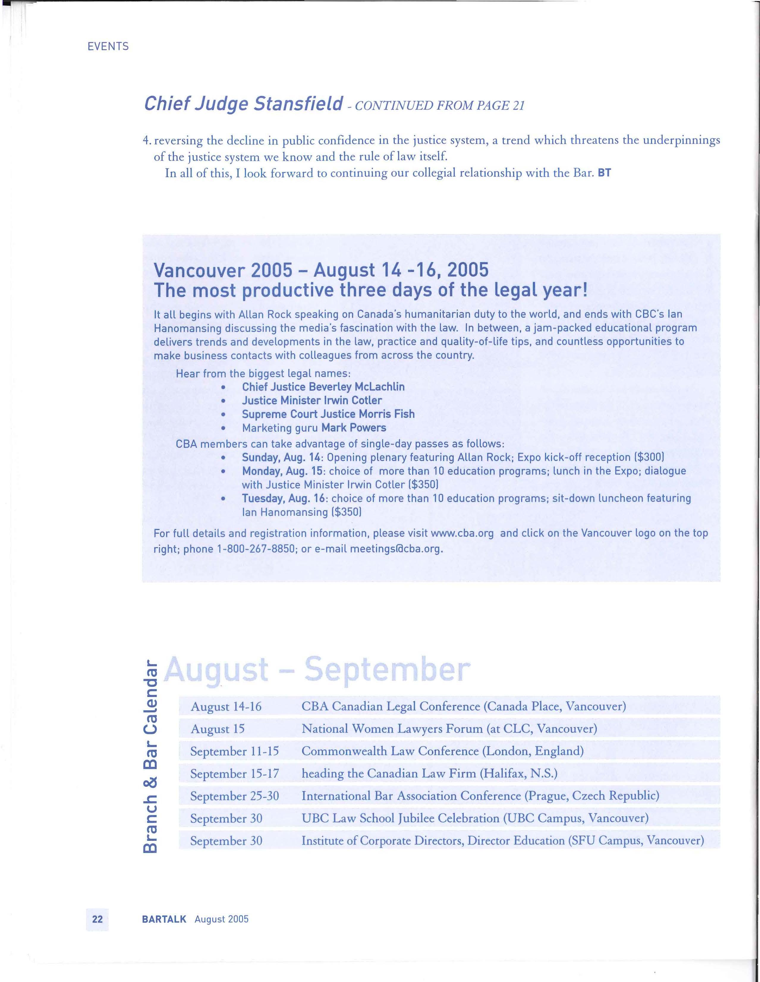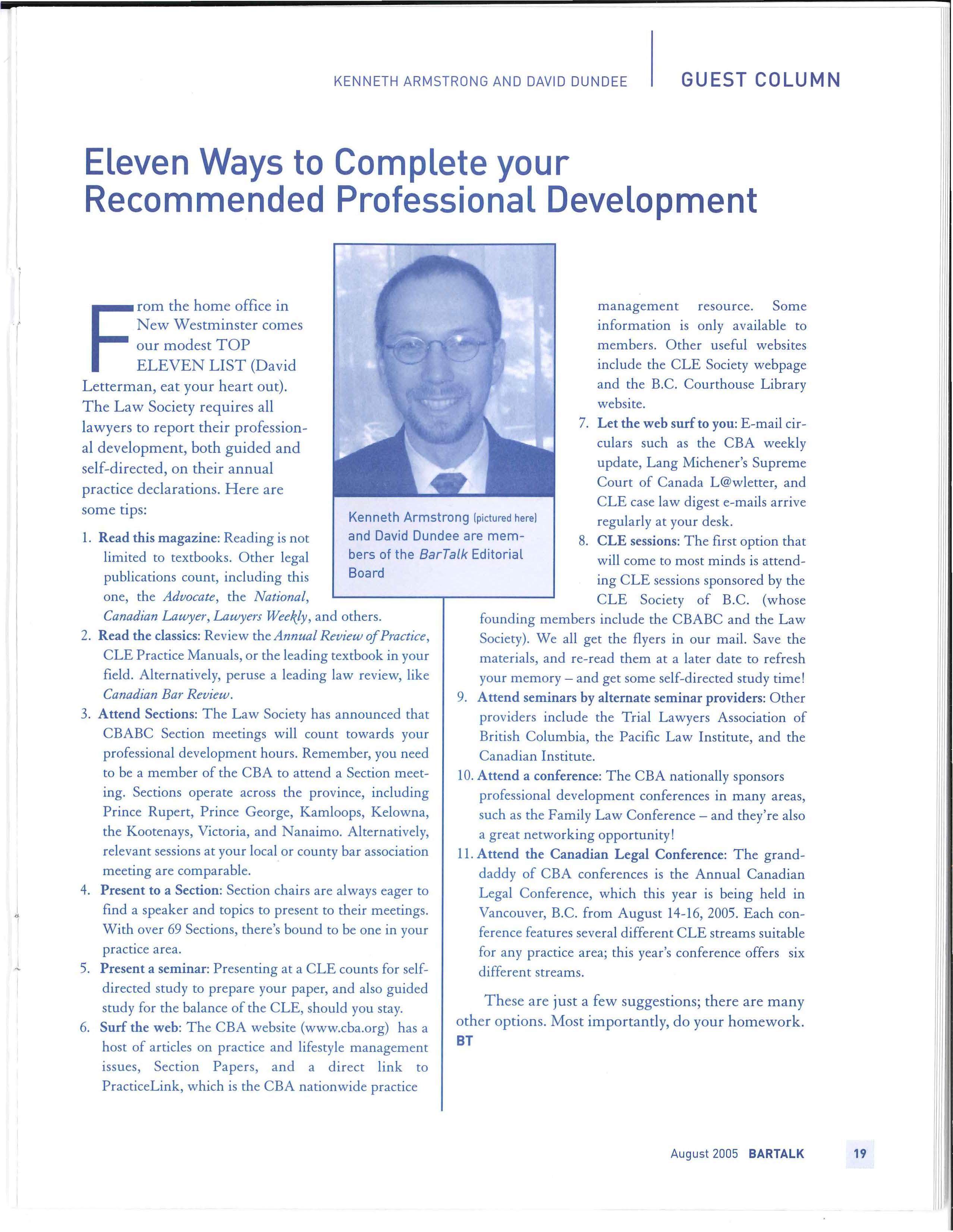 The summer is drawing to a close, and it is a time of change and reflection: we welcome the new Chief Judge, and bid farewell to an outgoing CBABC President. Change is exciting and energizing, and we are all looking forward to a new year of CBA Section meetings. A brand new slate of CLE seminars is planned. Many will be attending the CBA Conference this month. For these reasons, it is a time of year when thoughts turn to professional development. Best of all, you can report some time spent reading BarTalk, but read it because you like it, not just because it's good for you.