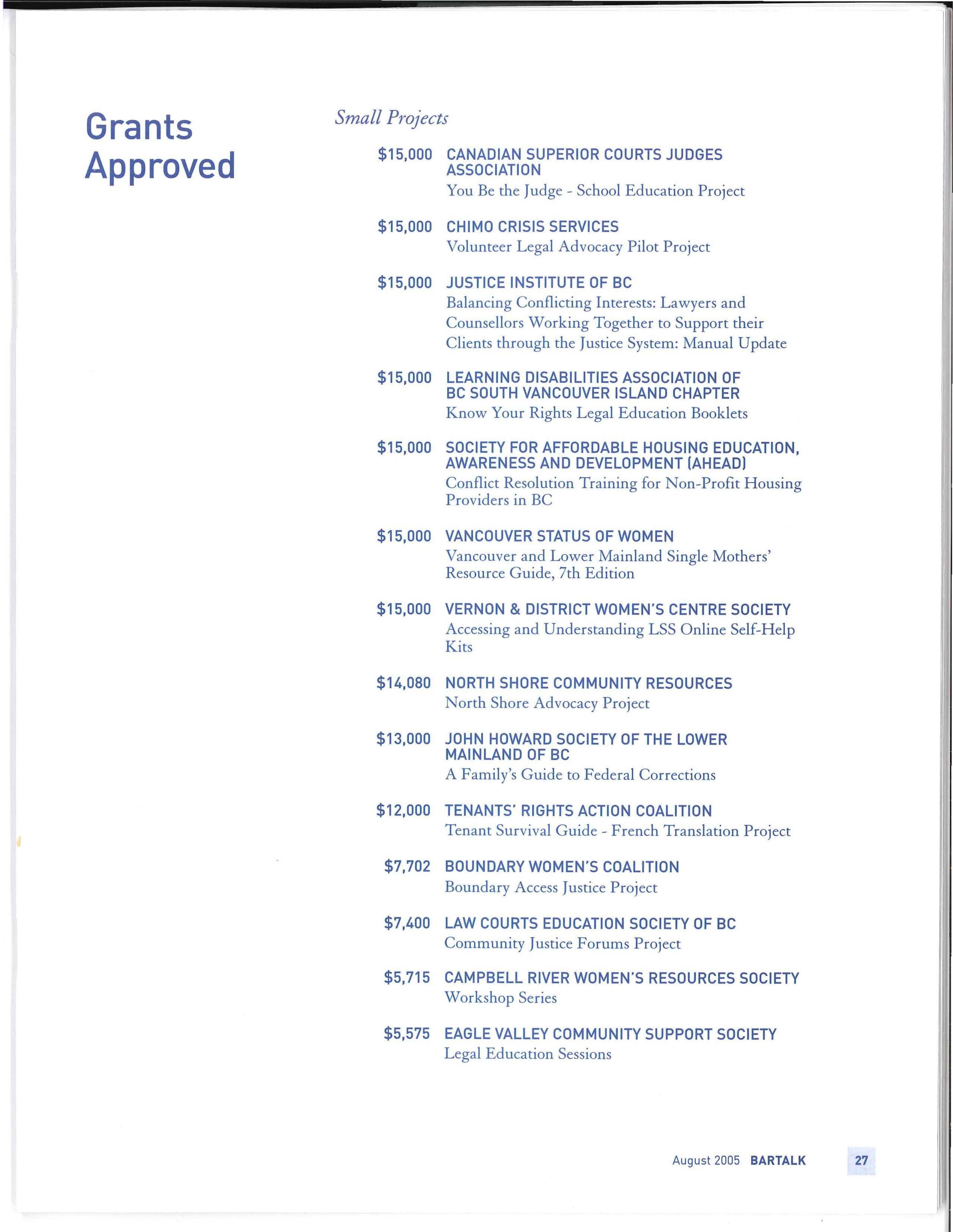 The Board of Governors of the Law Foundation of BC met on June 25, 2005. Chair Heather Raven is pleased to announce that funding totalling $829,807 has been approved for the following 14 small projects ($170,472) and 13 projects ($659,335).