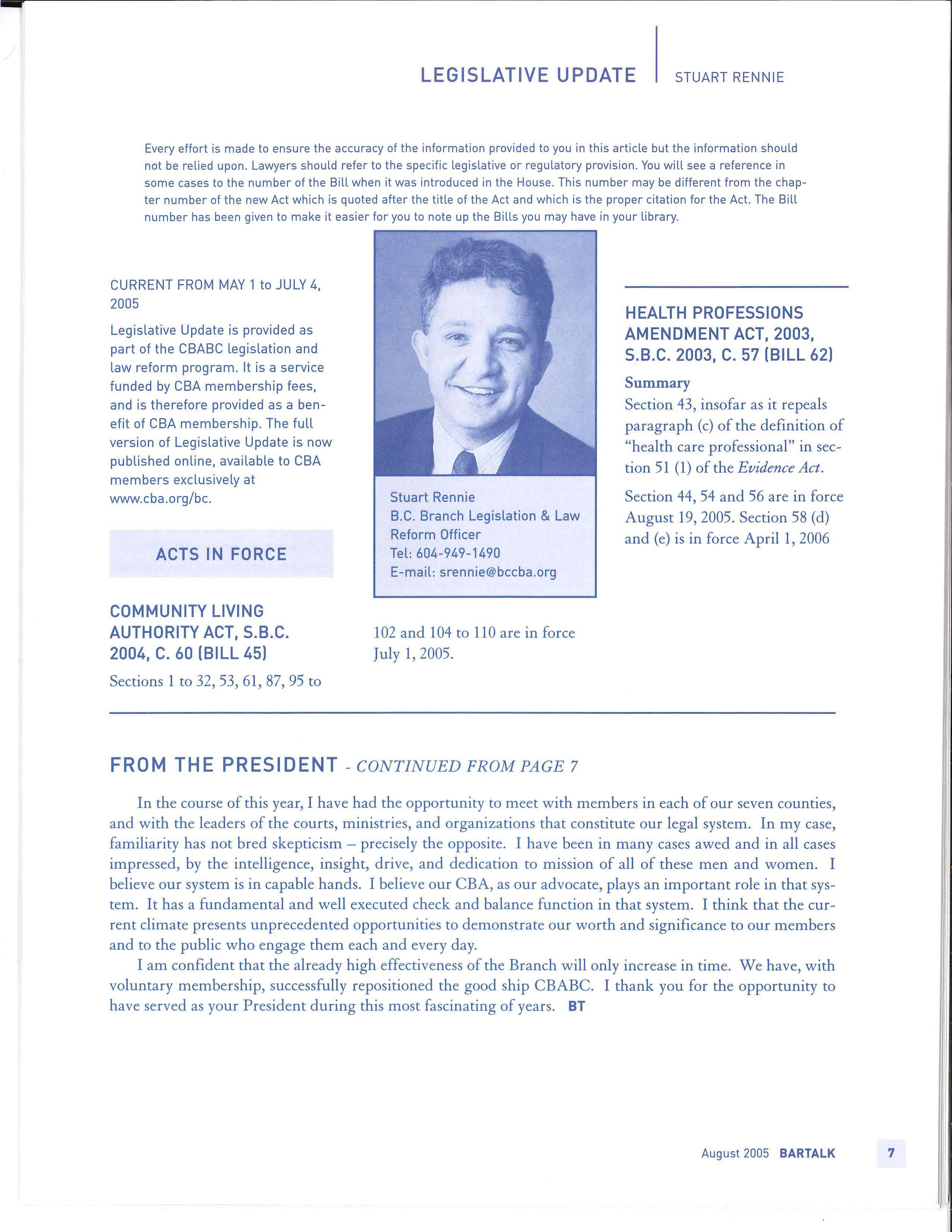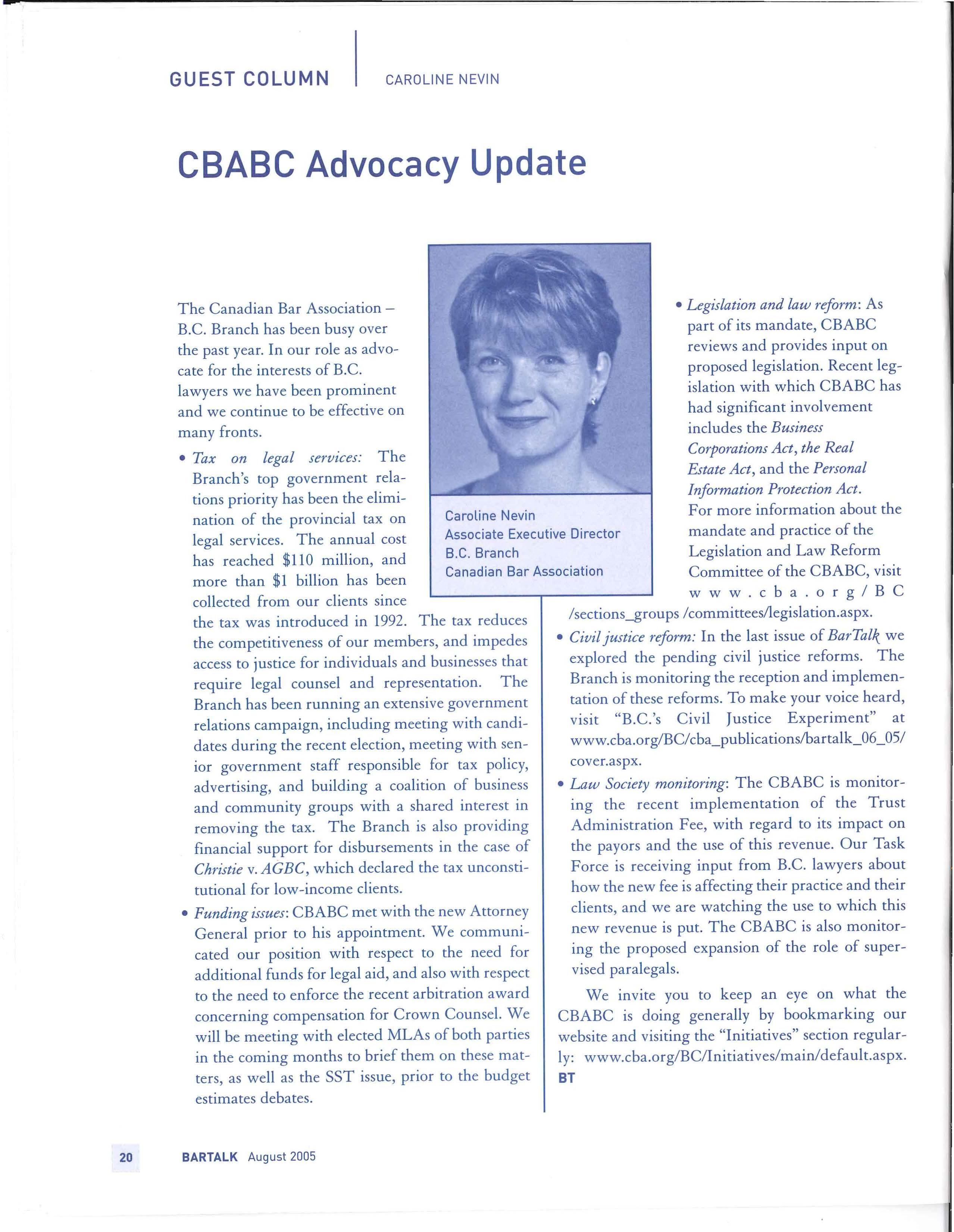 Legis l at ive U pdate is provided as part of the CBABC l eg islation and law reform program It is a service funded by CBA membership fees, and is therefore provided as a benefit of CBA membership The fu ll version of L eg is l ative Update is now published online, avai l ab l e to CBA members exclusively at www.cba org/bc.