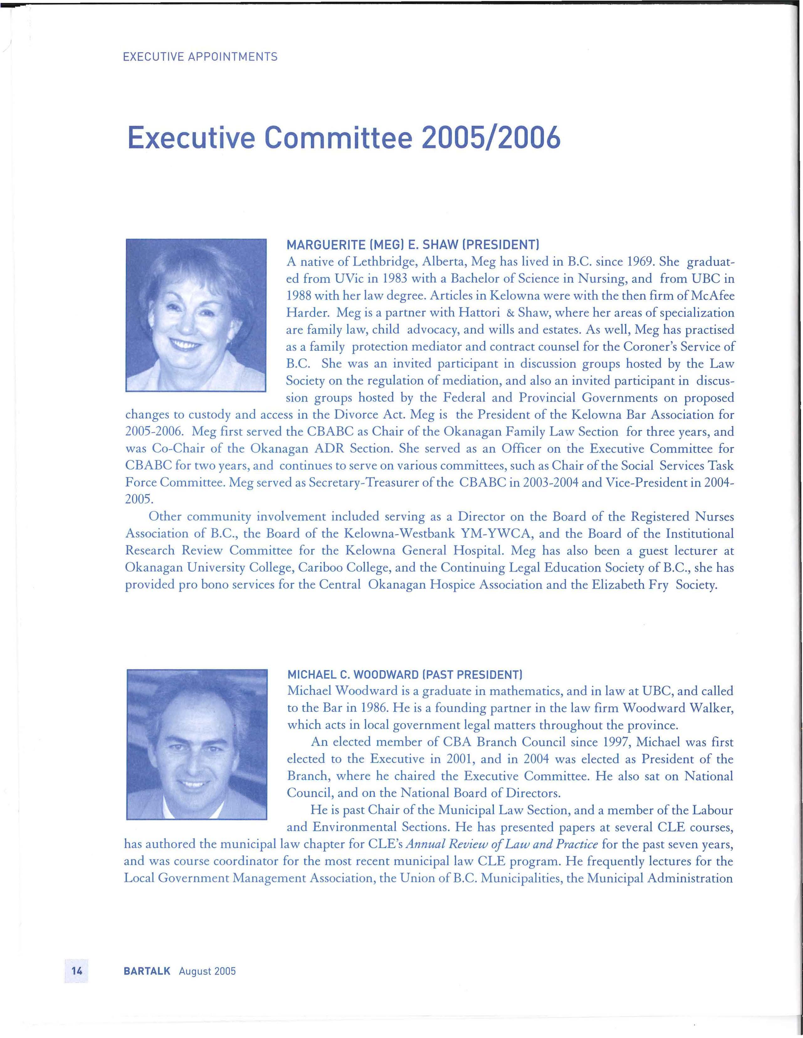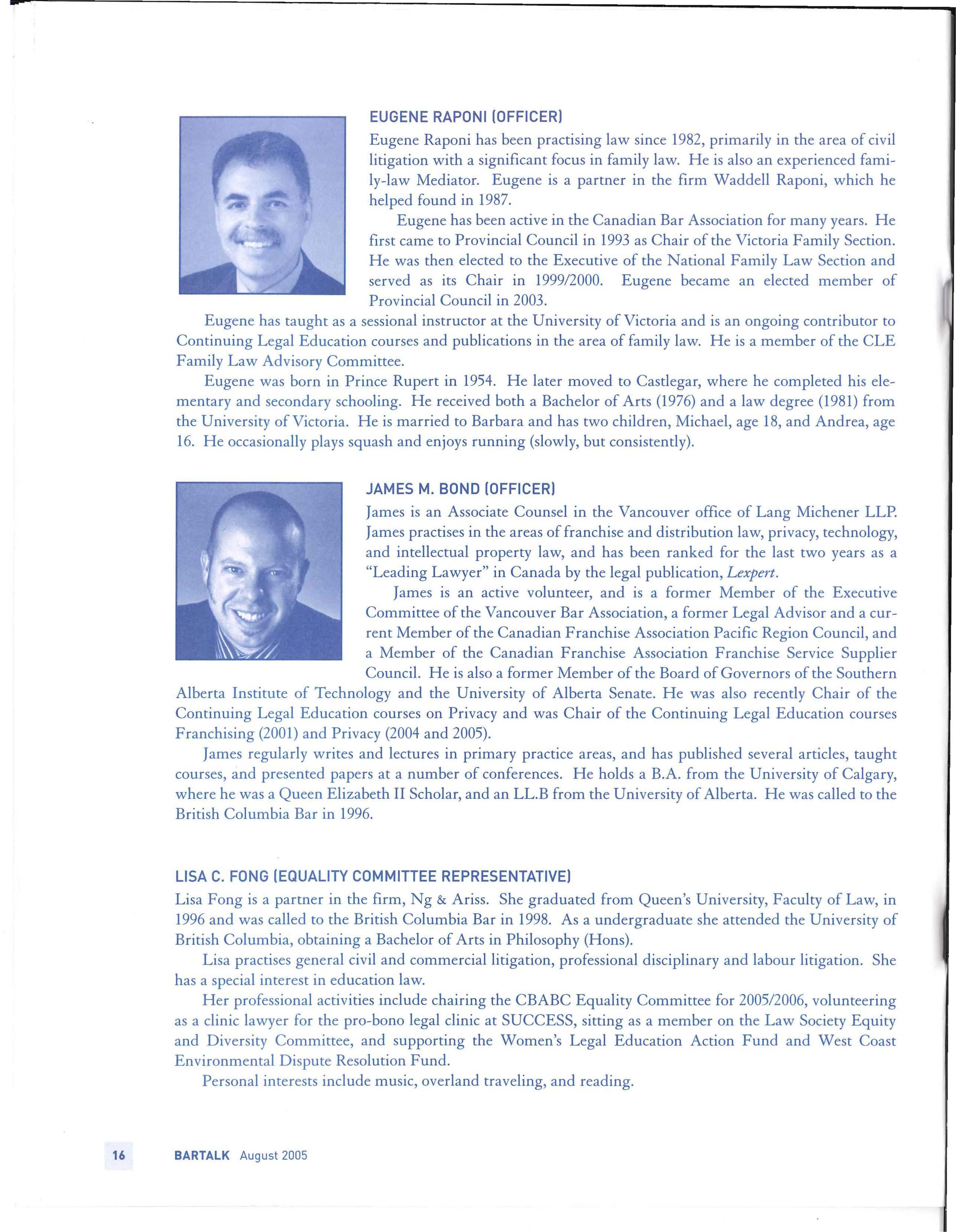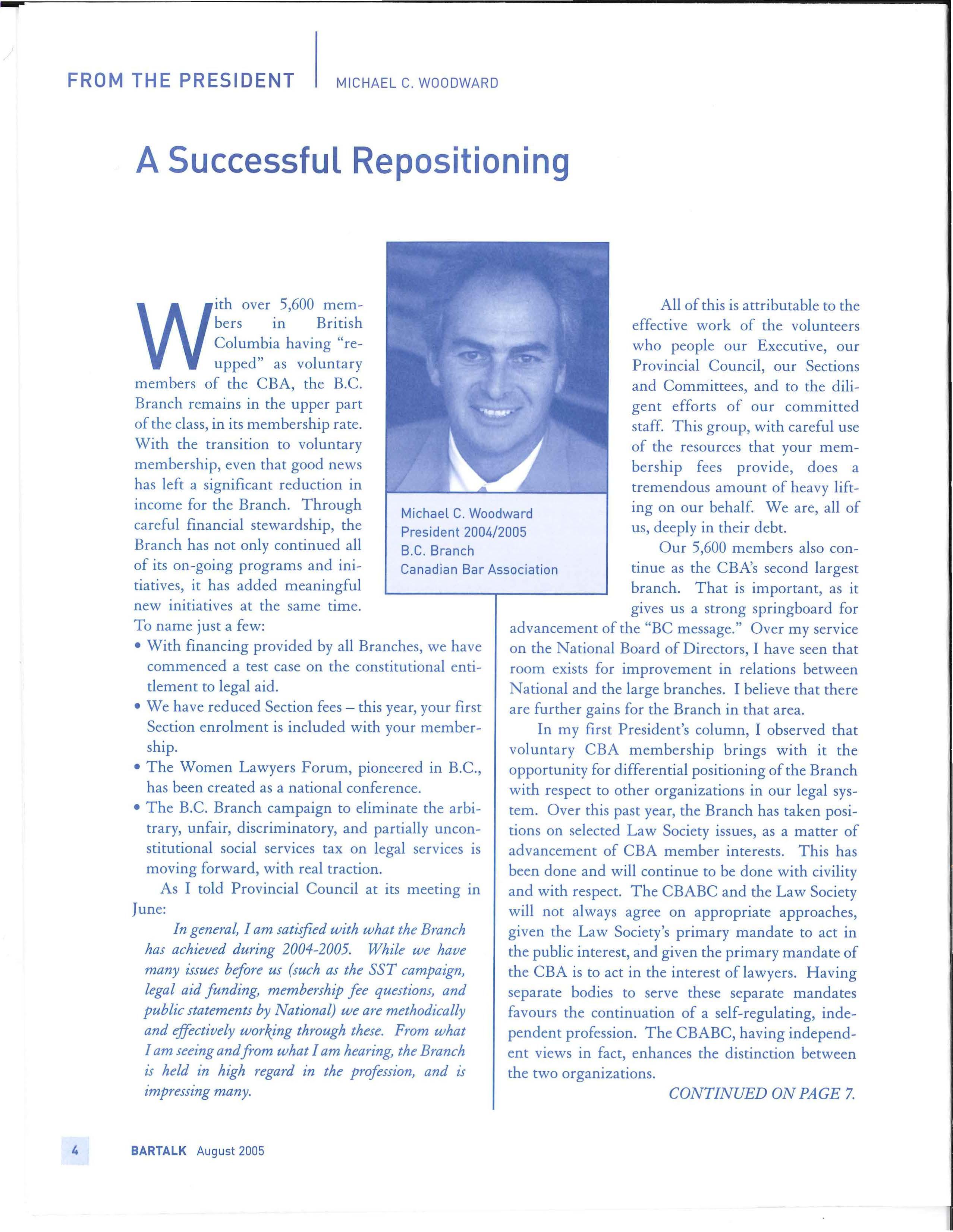 In general, I am satisfied with what the Branch has achieved during 2004-2005. While we have many issues before us (such as the SST campaign, legal aid funding, membership fee questions, and public statements by National) we are methodically and effectively working through these. From what I am seeing andfrom what I am hearing, the Branch is held in high regard in the profession, and is impressing many.