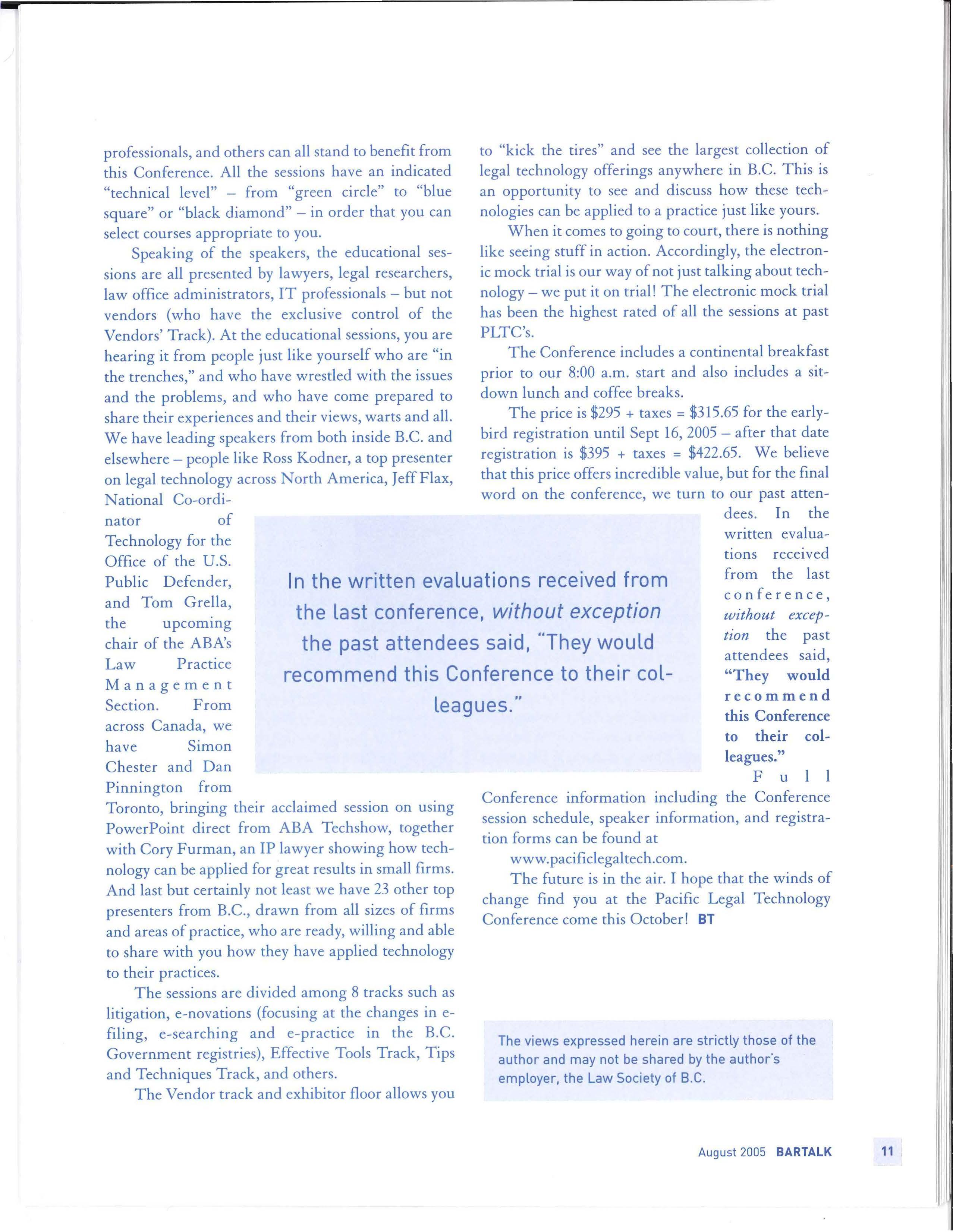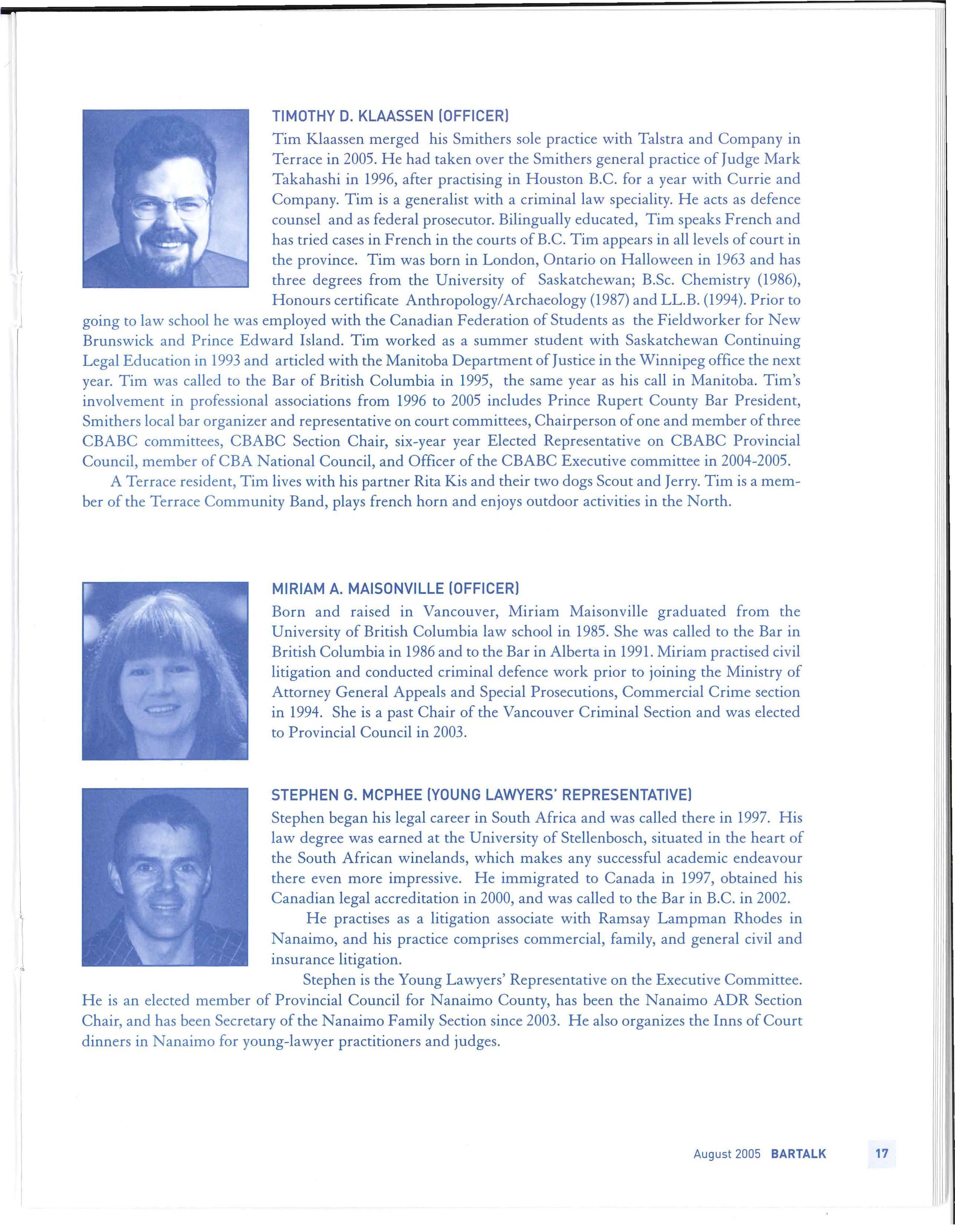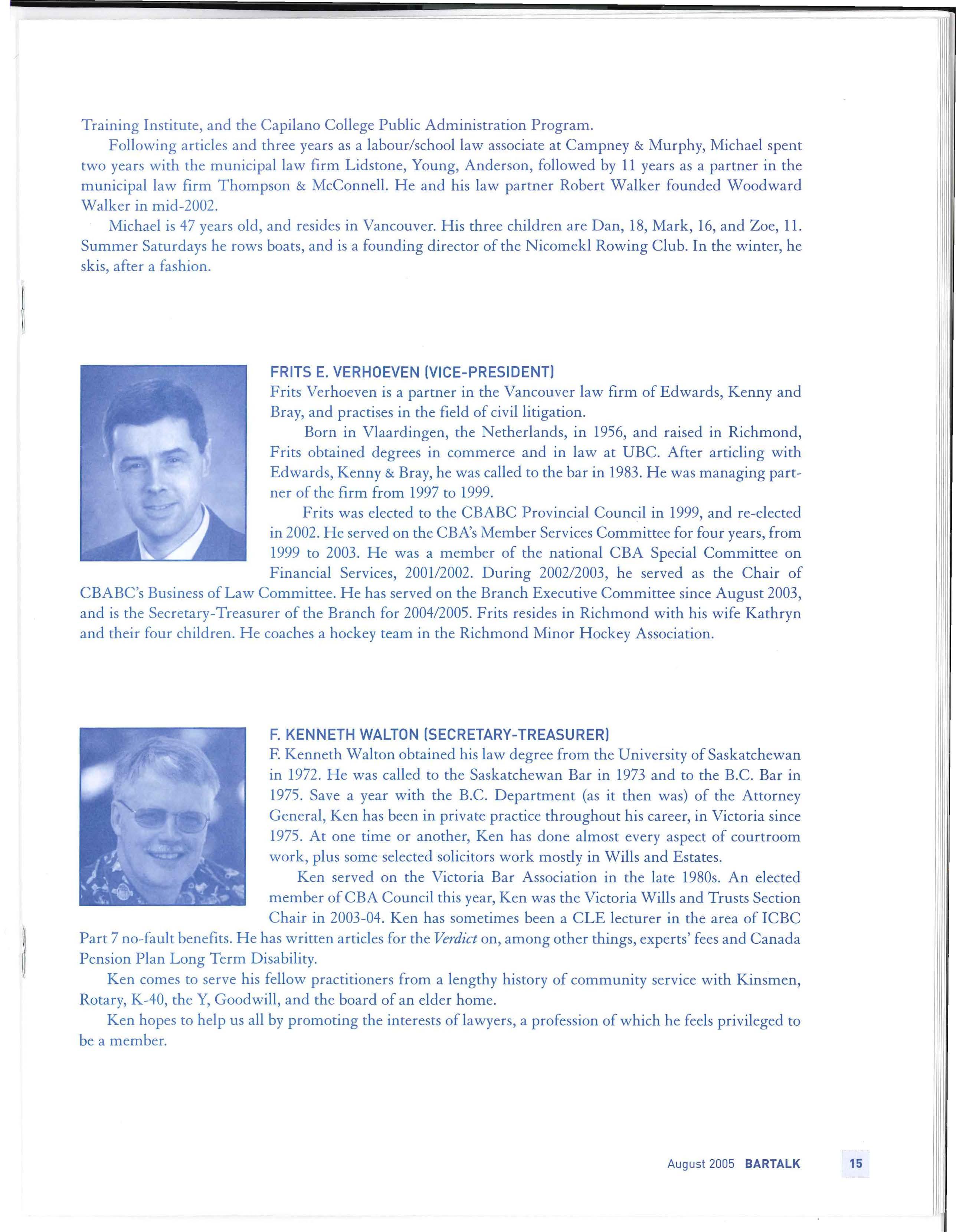 In general, I am satisfied with what the Branch has achieved during 2004-2005. While we have many issues before us (such as the SST campaign, legal aid funding, membership fee questions, and public statements by National) we are methodically and effectively working through these. From what I am seeing andfrom what I am hearing, the Branch is held in high regard in the profession, and is impressing many.
