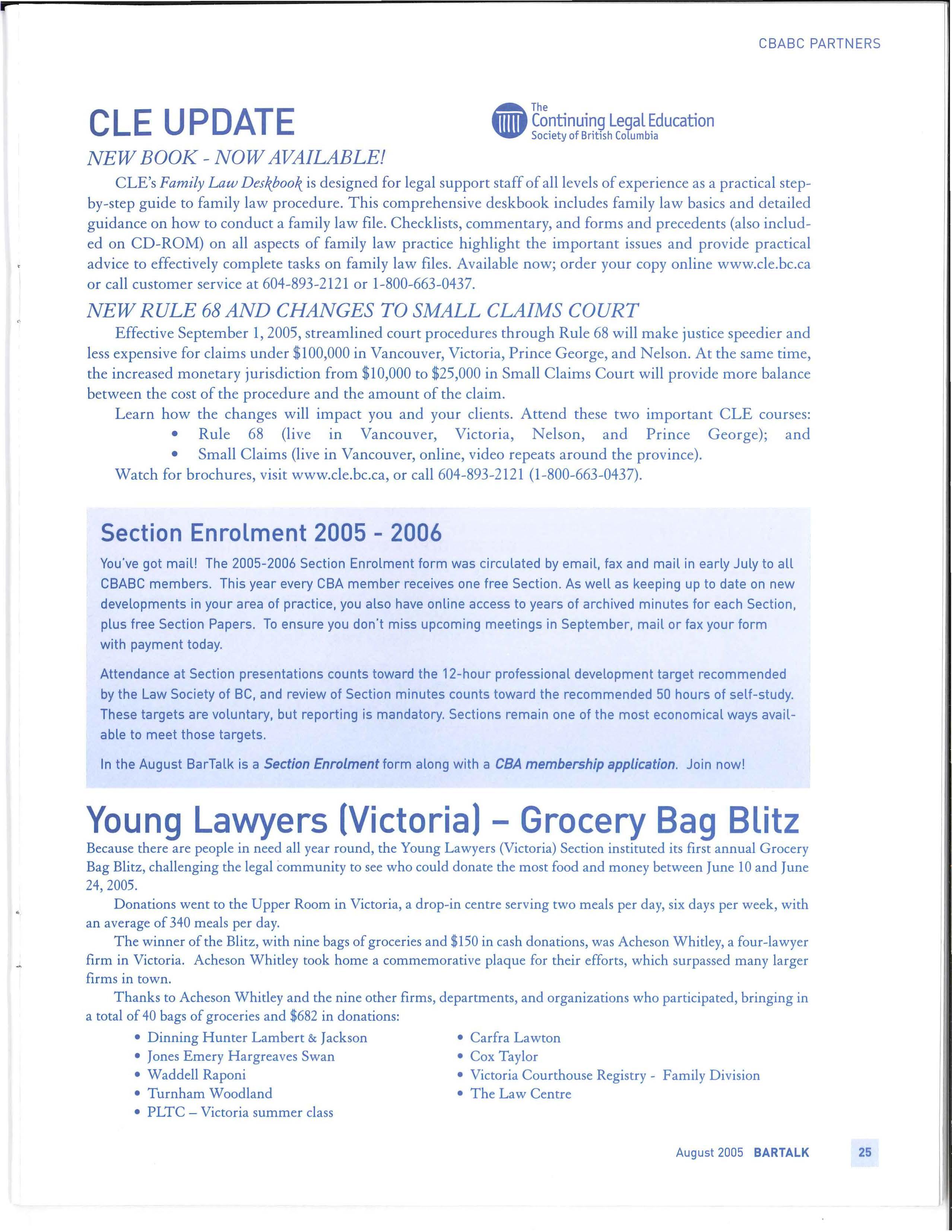Because there are people in need all year round, the Young Lawyers (Victoria) Section instituted its first annual Grocery Bag Blitz, challenging the legal community to see who could donate the most food and money between June 10 and June 24,2005.