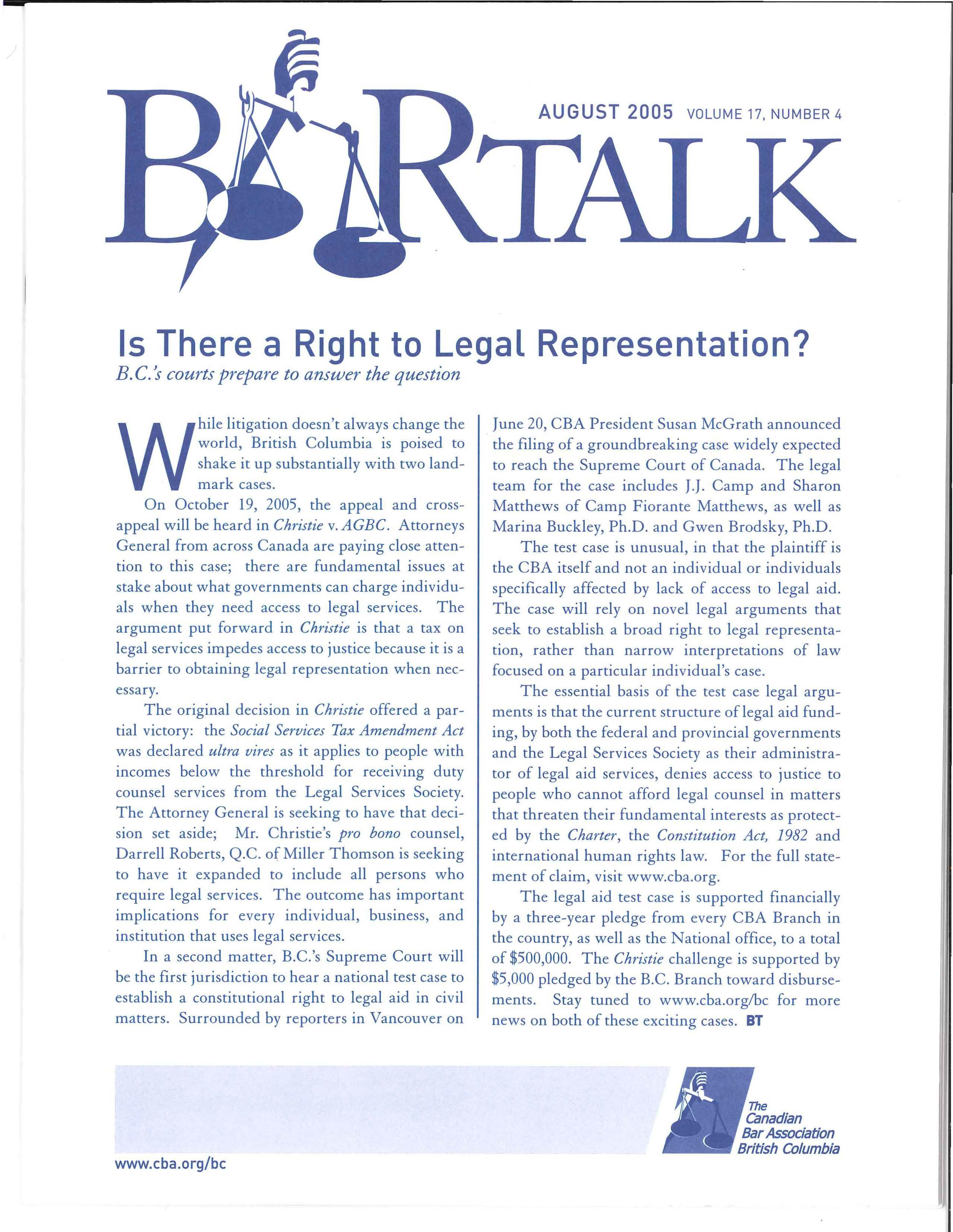 On October 19, 2005, the appeal and crossappeal will be heard in Christie v. AGBC. Attorneys General from across Canada are paying close attention to this case; there are fundamental issues at stake about what governments can charge individuals when they need access to legal services. The argument put forward in Christie is that a tax on legal services impedes access to justice because it is a barrier to obtaining legal representation when necessary.