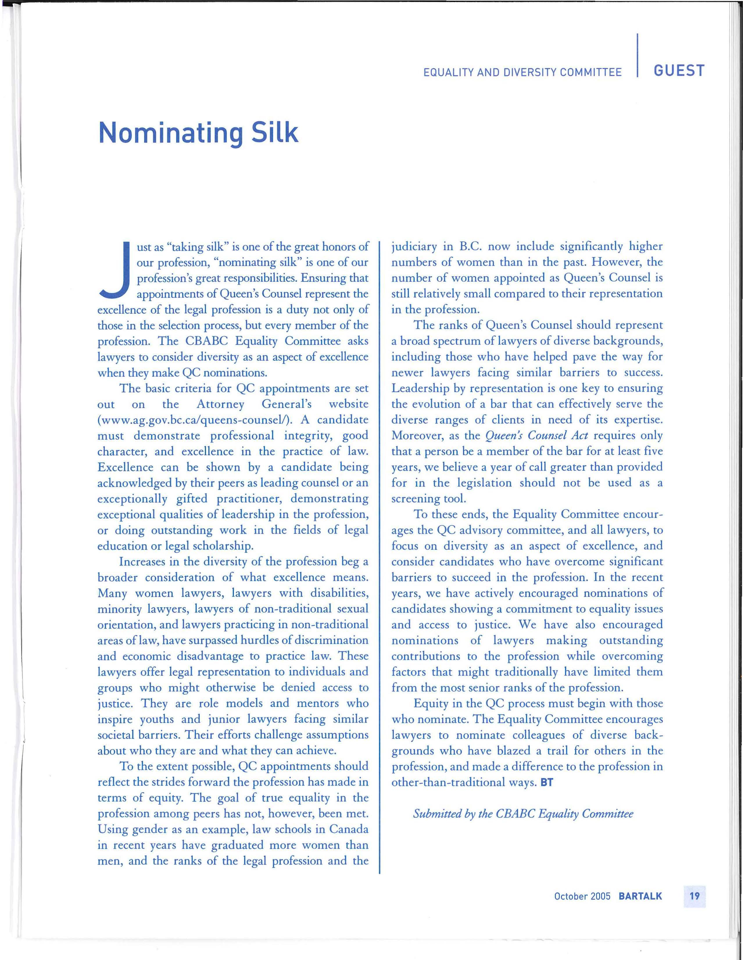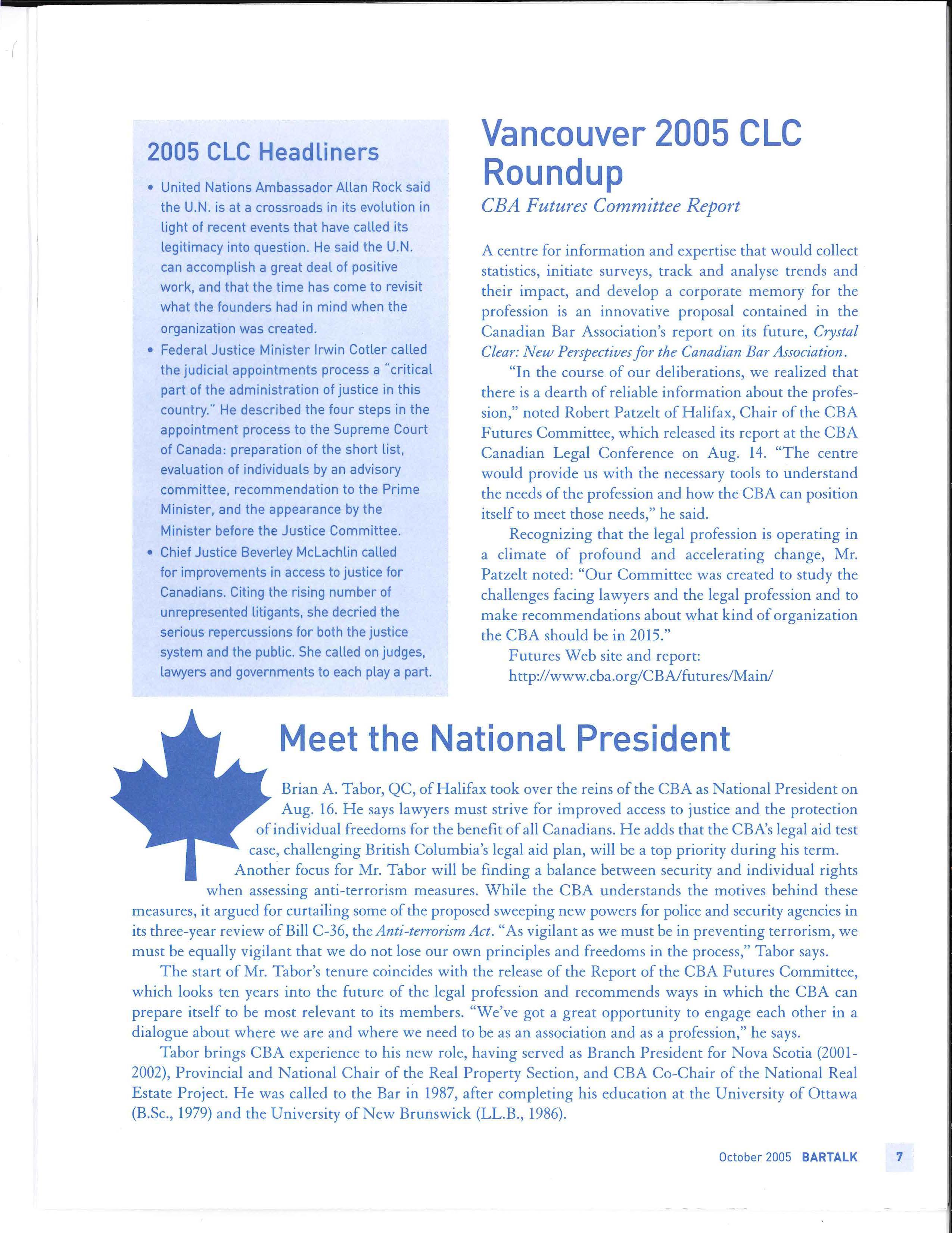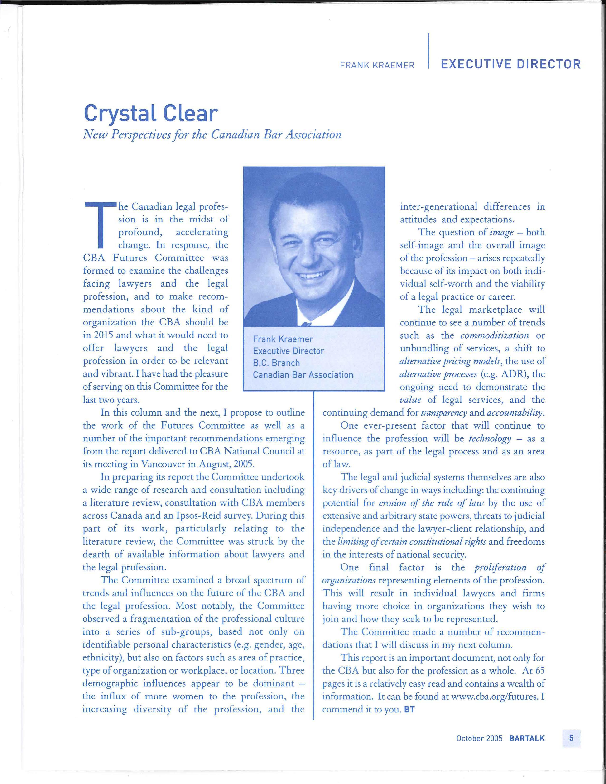 In thi s column and the next, I propose to outline the work of t he Futures Committee as well as a number of the important recommendations emerging from the report delivered to CBA National Council at its meeting in Vancouver in August, 2005.