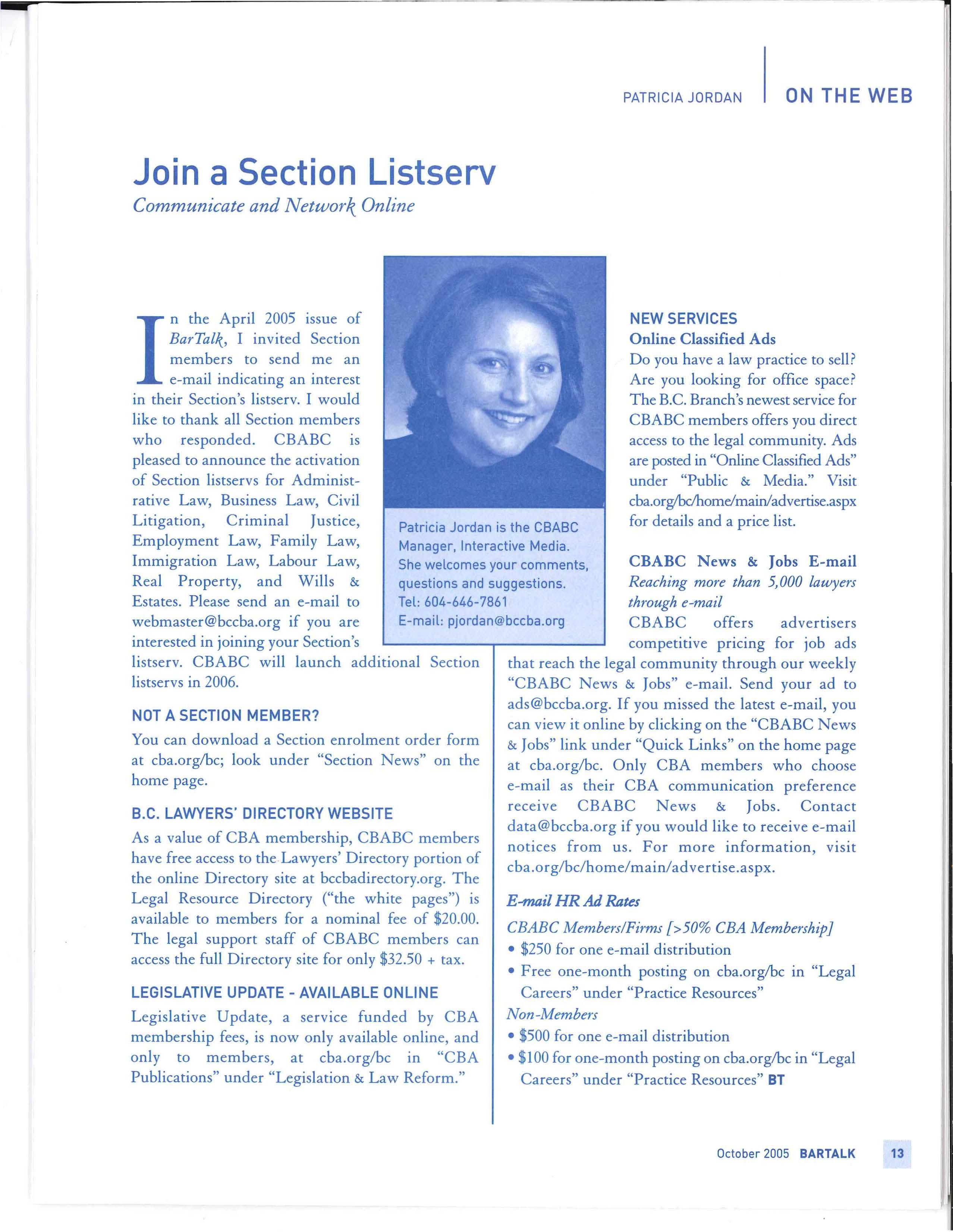 If you have changed firms, addresses, e-mail addresses or phone/fax numbers, you need to let us know. E-mail us at data@bccba.org, phone 604-687-3404 or fax 604-669-9601 or contact us toll-free [phone 1-888687-3404, fax 1-877-669-9601).
