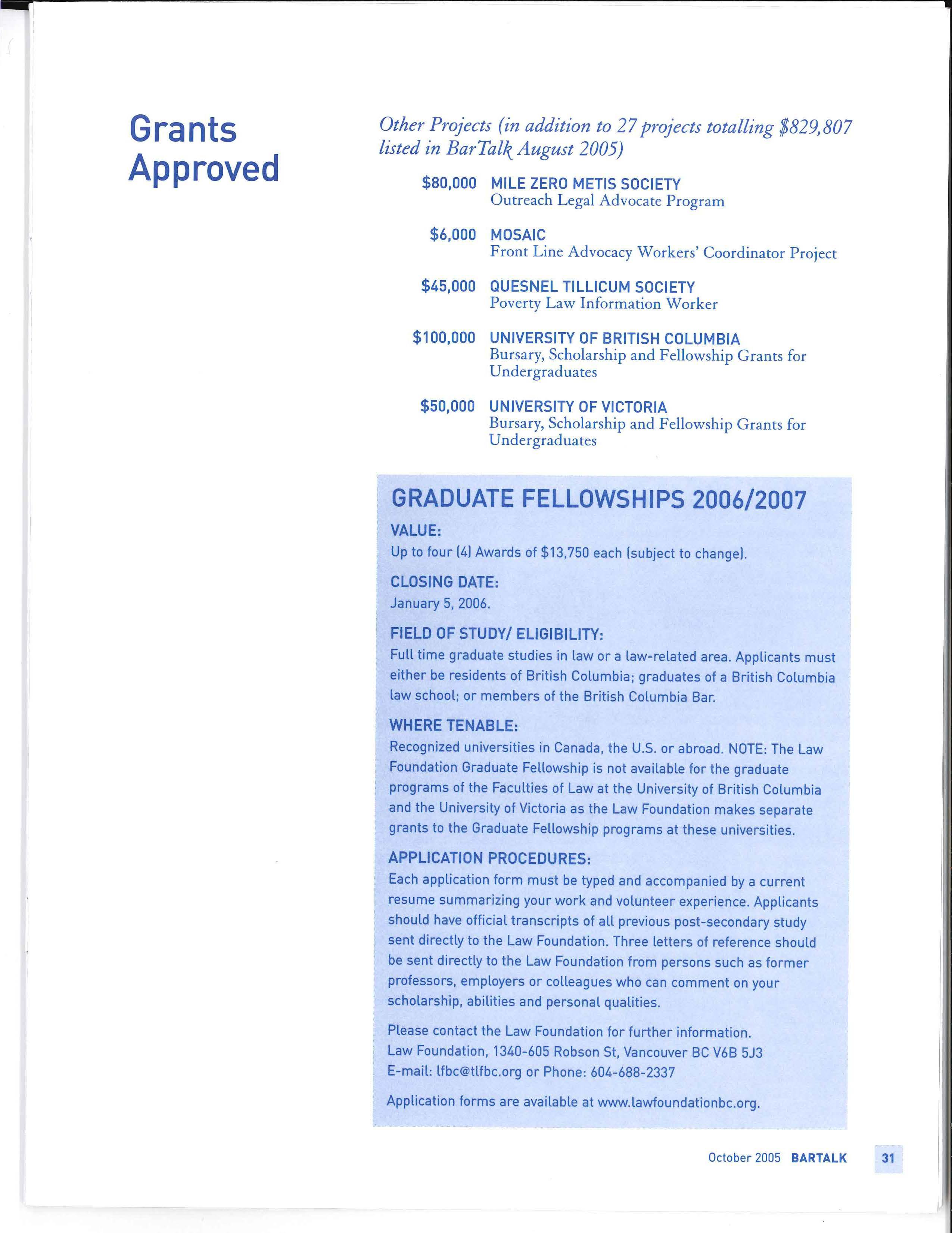 The Board of Governors of the Law Foundation of B.C. met on June 25, 2005. Chair Heather Raven is pleased to announce that funding totalling $3, 799,914 has been approved for the following 17 continuing programs. In addition, the Foundation approved 32 projects for $1,110,807 at the june meeting. Most of the projects were listed in the August 2005 issue of the balance are listed as follows.