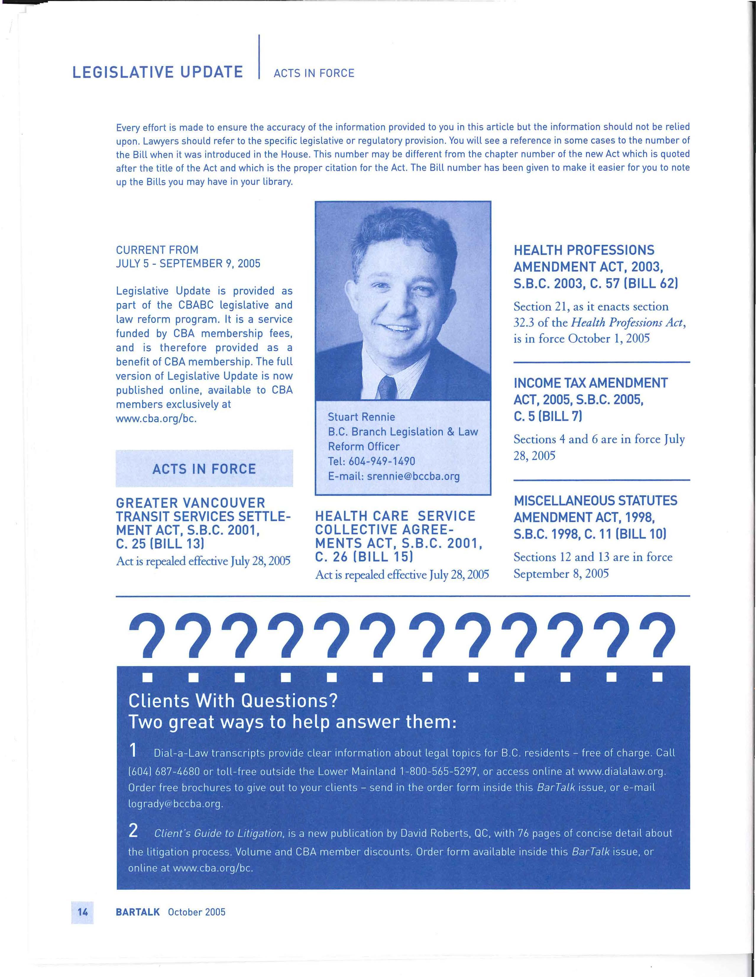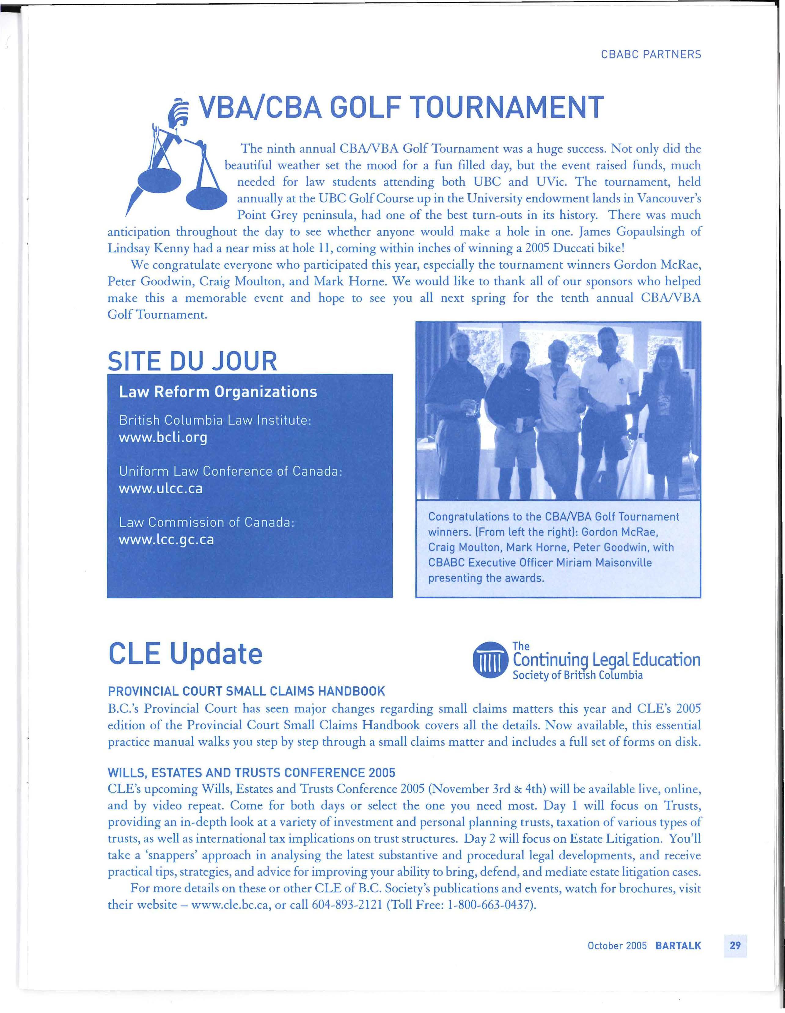 For more details on these or other CLE of B.C. Society's publications and events, watch for brochures, visit their website- www.cle.bc .ca, or call 604-893-2121 (Toll Free: 1-800-663-0437).