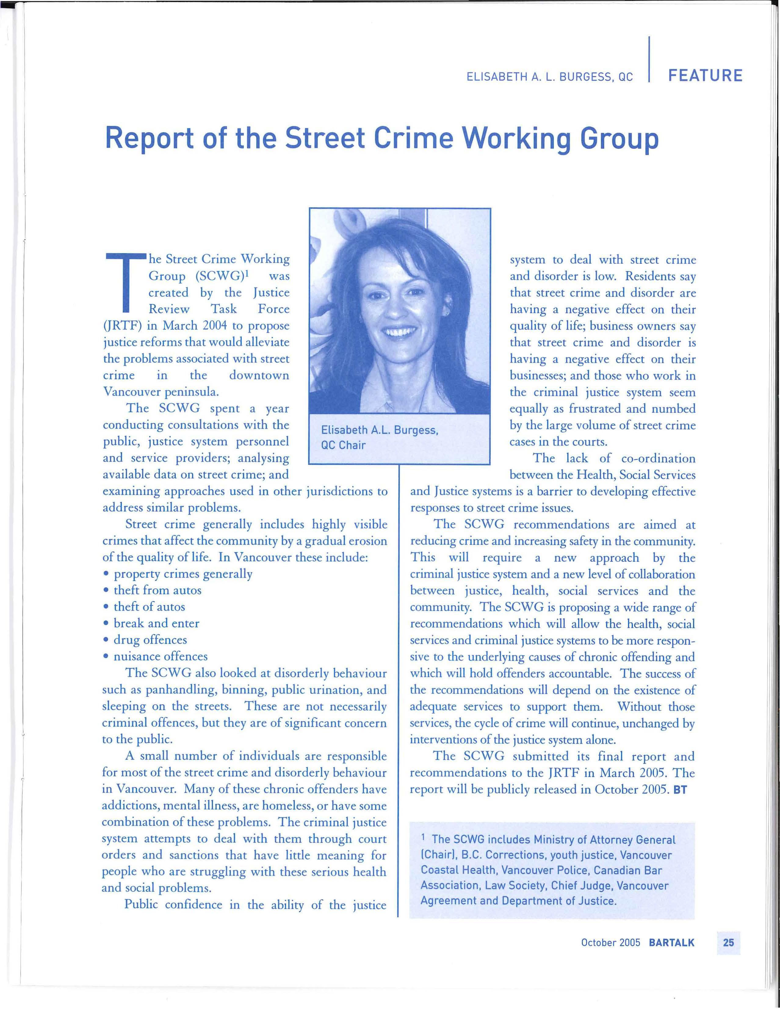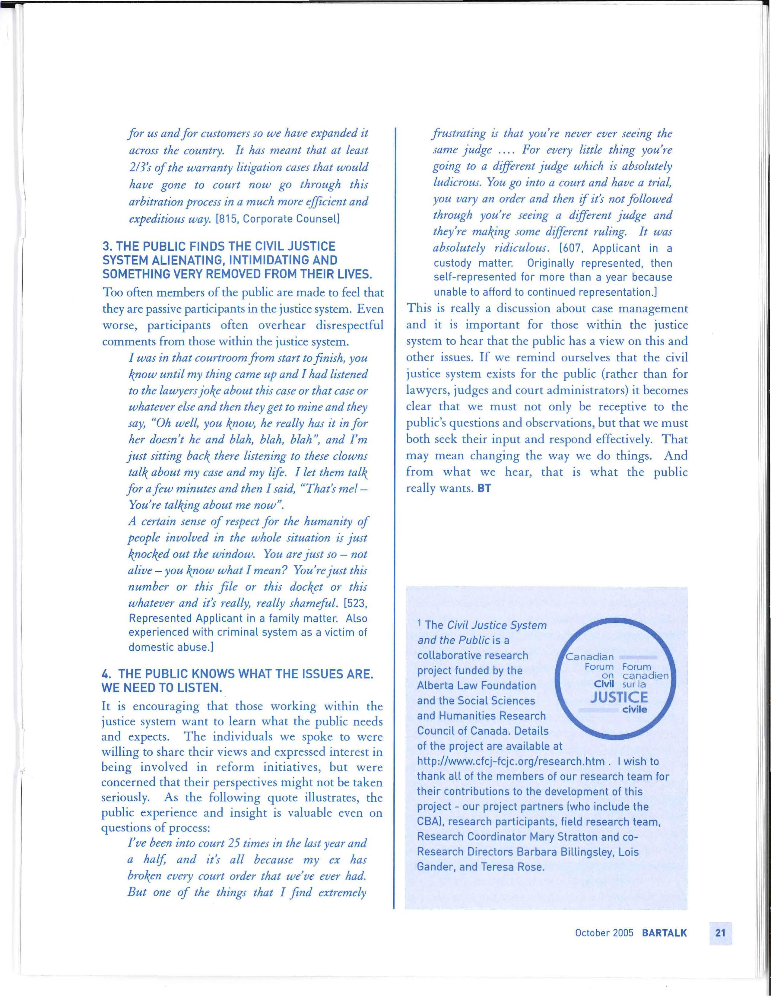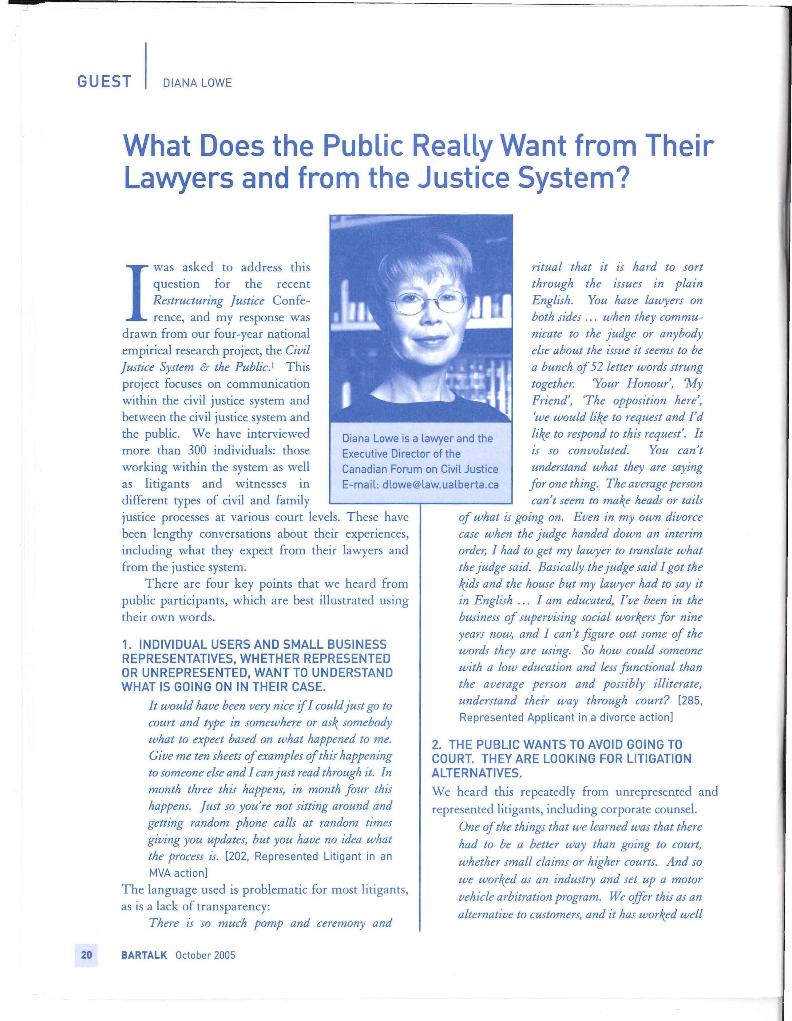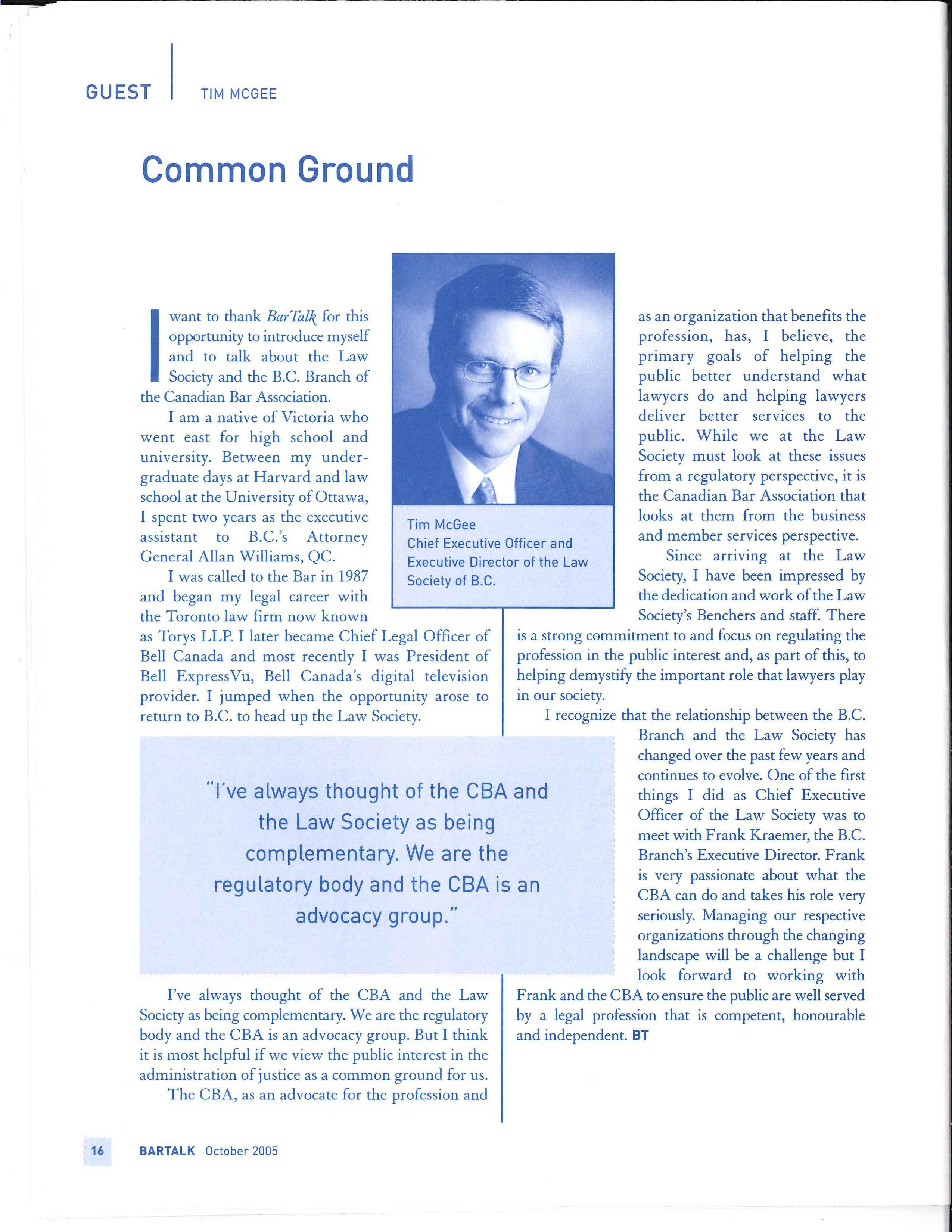 This issue of BarTalk provides a look at some of the activities happening in justice reform I encourage you to take the time to read the articles, think about the issues involved, and let the CBA know if you have any concerns you feel should be raised. Together, we can work to ensure that the voice of lawyers is heard. BT