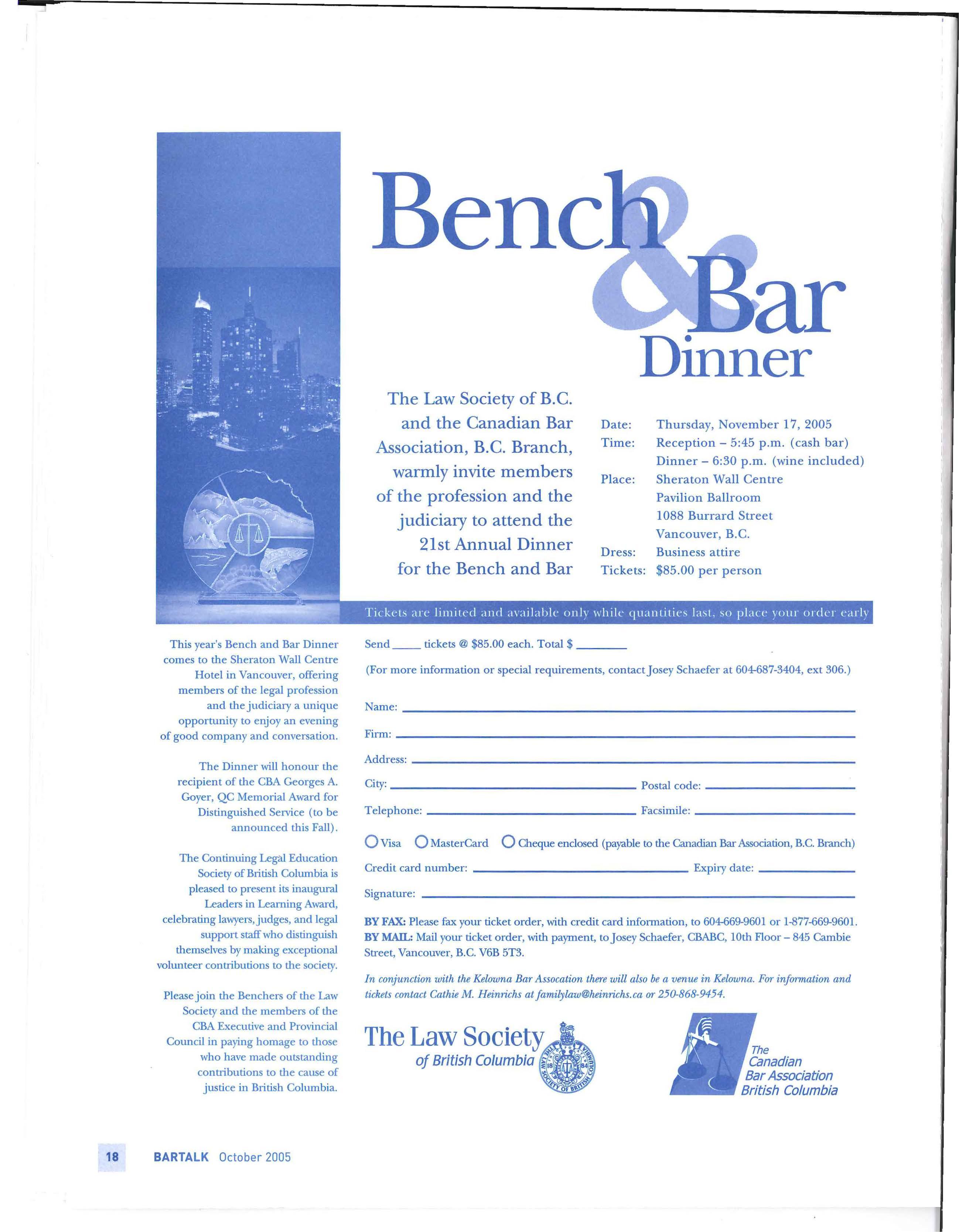 CBABC hosted a special reception at the Terminal City Club at the recent Canadian Legal Conference in Vancouver As is the tradition of the B.C Branch, this was the occasion on which the ··mantle of office"" was officially transferred from the outgoing to incoming President. 2004/05 President Michael Woodward presented Past President Robert Brun, QC with his President"s Medal, and 2005/06 President Meg Shaw presented Michael Woodward with his Medal. Incoming Executive Committee members were introduced, and Ms . Shaw introduced herself and her perspective on her coming year as President.