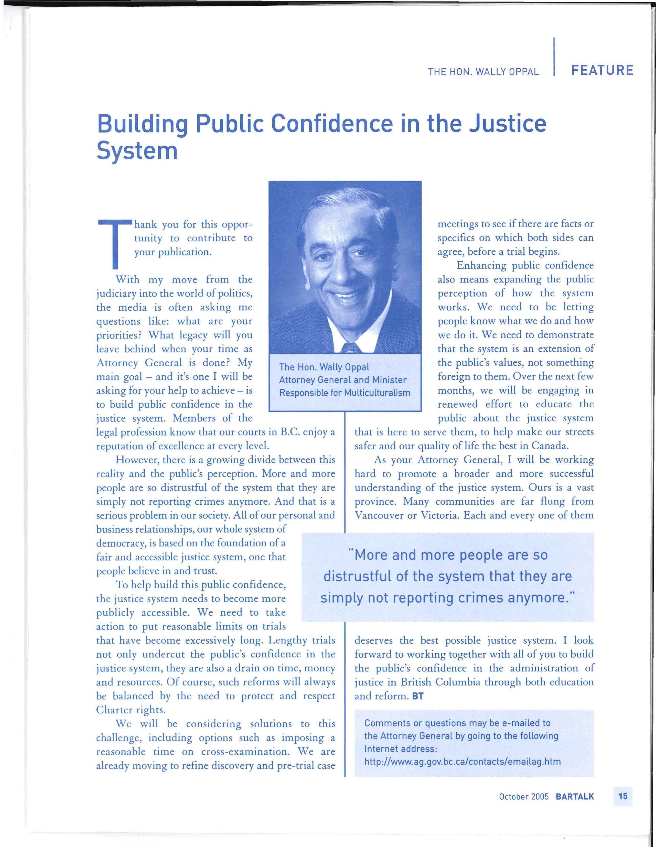 delivery of justice, try to change it." The delivery of justice in British Columbi a is undergoing scrutiny and criticism like never before. Under the former Attorney General, Geoff Plant, justice review was an important initiative, and this review continues today with groups, committees, and organizations analysing, researching, reporting, and recommending changes to the way that justice is delivered. Changes and reform , when carried out, will have an impact on the lawyers of this province