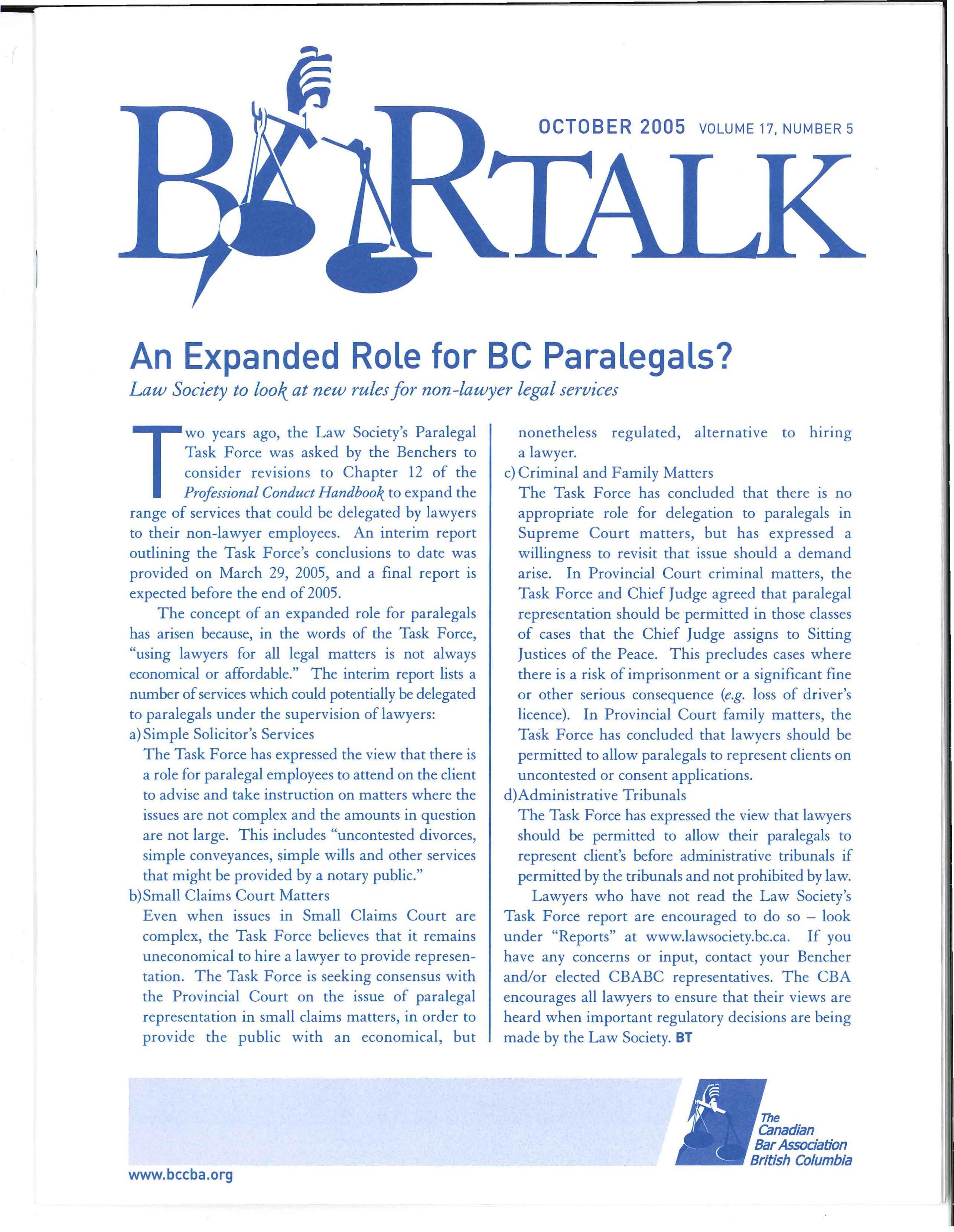Two years ago, the Law Society's Paralegal Task Force was asked by the Benchers to consider revisions to Chapter 12 of the Professional Conduct Handbook to expand the range of services that could be delegated by lawyers to their non-lawyer employees. An interim report outlining the Task Force's conclusions to date was provided on March 29, 2005, and a final report is expected before the end of 2005.