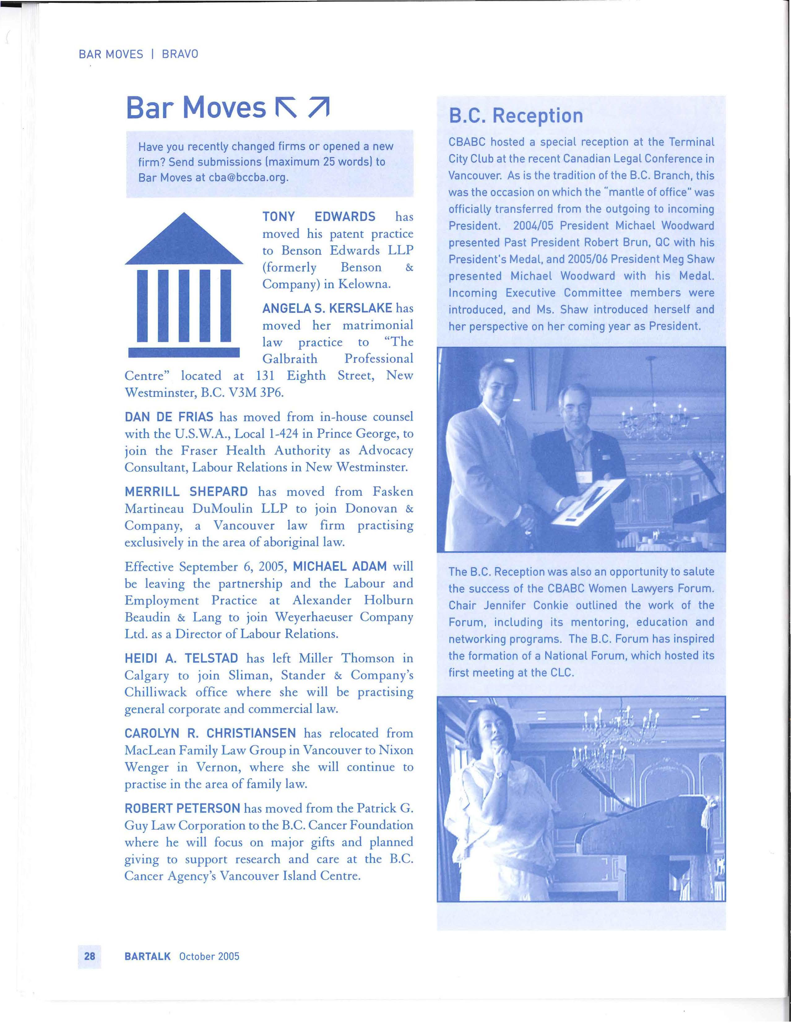 Have you recently changed firms or opened a new firm? Send submissions (maximum 25 words) to Bar Moves at cba@bccba org.
