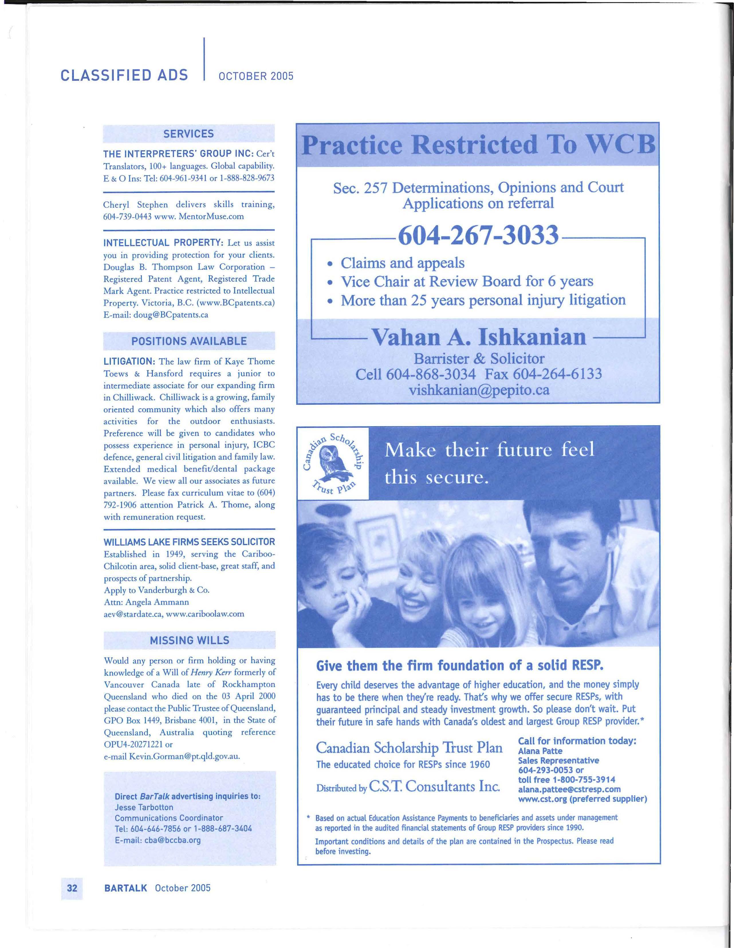 Preference will be given to candidates who possess experience in personal injury, ICBC defence, general civil litigation and family law Extended medical benefit/dental package ava ilable We view all our associates as future partners Please fax curriculum vitae to (604) 792-1906 attention Patrick A. Thome , along with remuneration request.