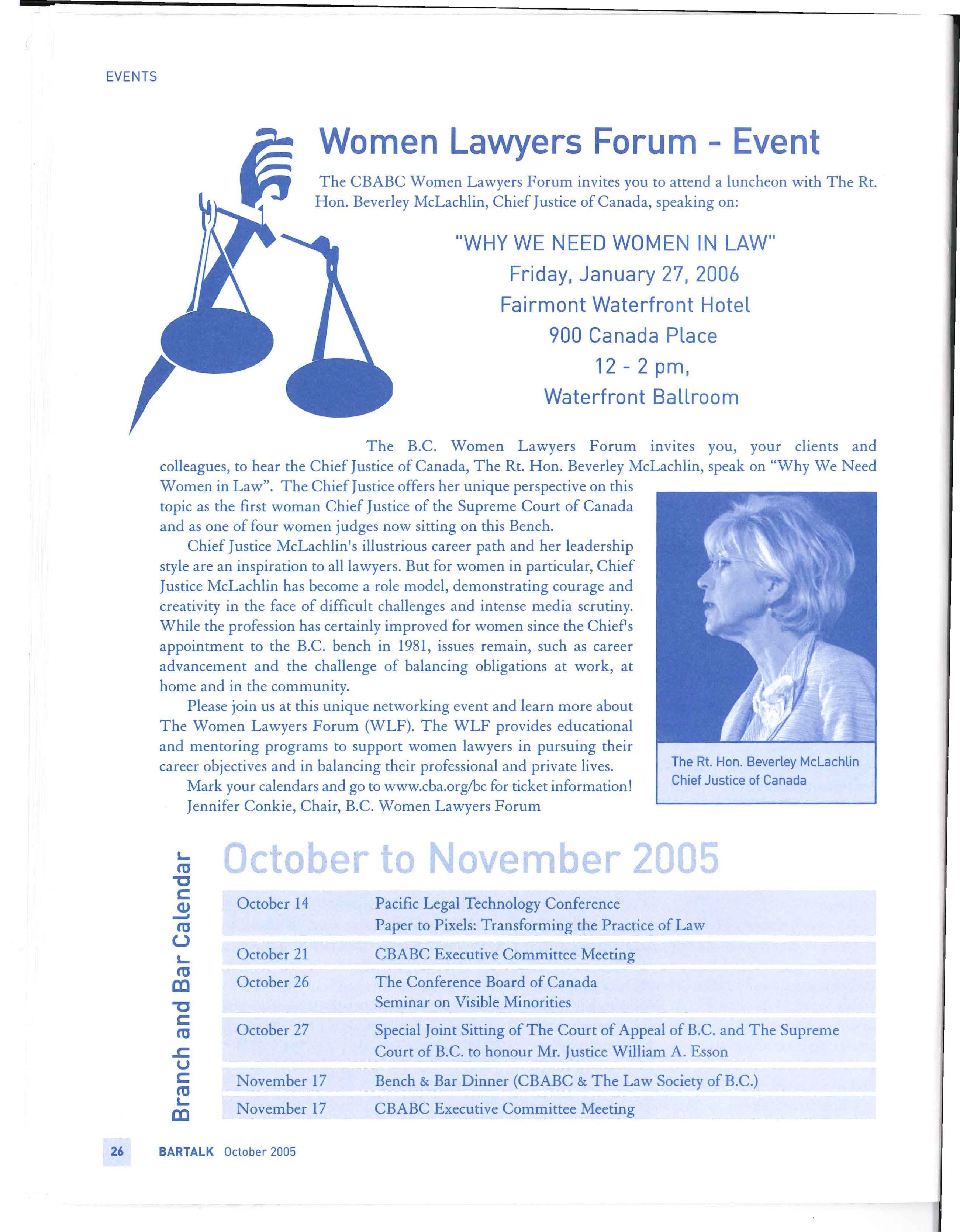 The National CBA has caught a B.C. wave with the inaugural meeting of the National Women Lawyers Forum held at the Annual Canadian Legal Conference in Vancouver on Monday, August 15th, 2005. The organizing of the National Forum saw the election of the first executive with powerhouse volunteers from across Canada: Chair, Kerry - Lynne Findlay, QC (B.C.) ; ViceChair, Kathleen Quigg (N.B.), Secretary/Treasurer, Sheryl Beckford (Ont.), Members -at-Large, Julia Cornish (N.S.), Noemi Gal-Or (B.C.), Joanne Horton (Ont.), and Sharon Pratchler (Sask.) Rounding out the present executive is Jennifer Conkie as Chair of the British Columbia WLF. As other Branch divisions are formed, each Forum Chair will join the national executive committee. Our first meeting was well attended with interested CBA members from virtually every Branch . We were also visited by Caroline Flanagan of the Law Society of Scotland, who wants to see our successes here replicated back home B .C. Branch President, Meg Shaw, was there to express her support, as was Brian A. Tabor, QC on behalf of the national executive.