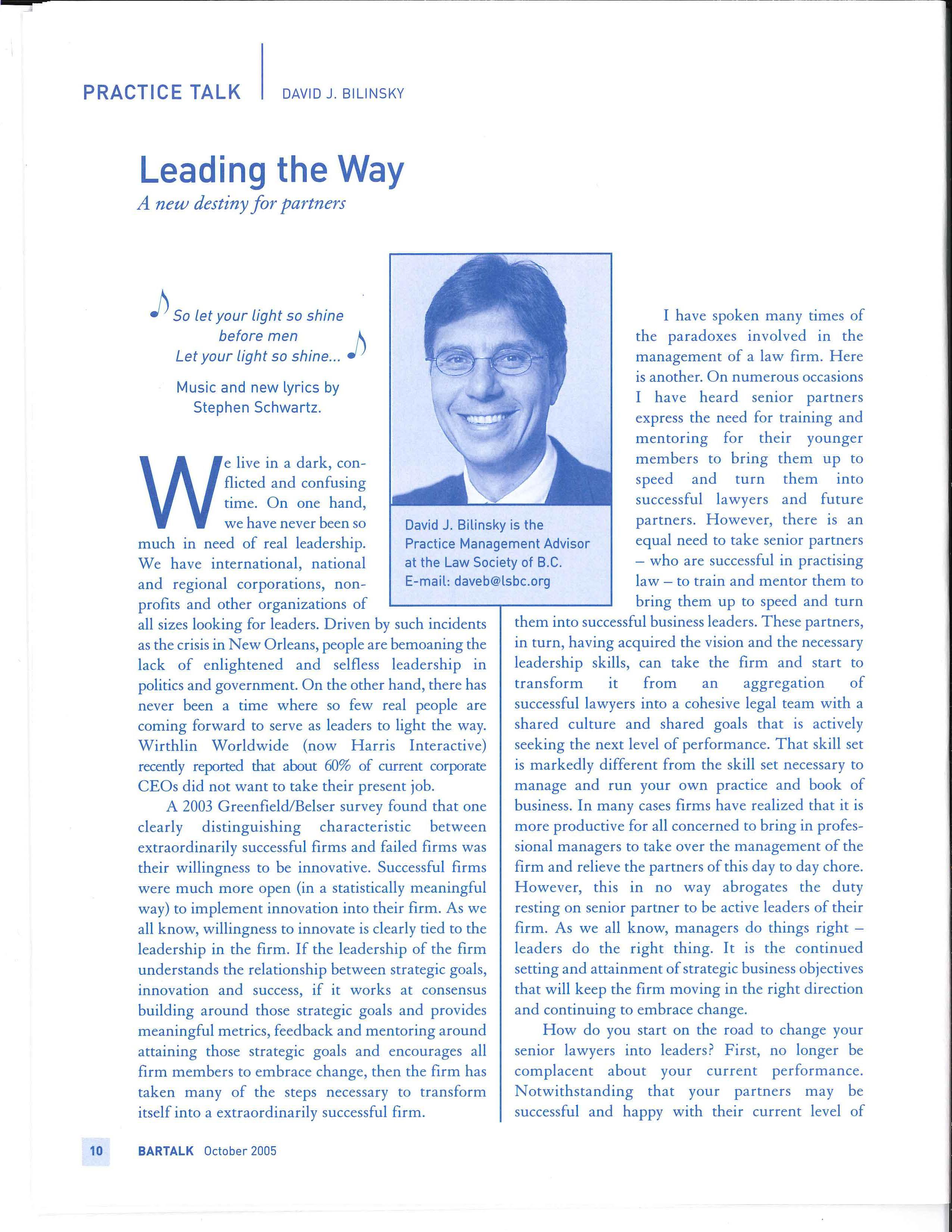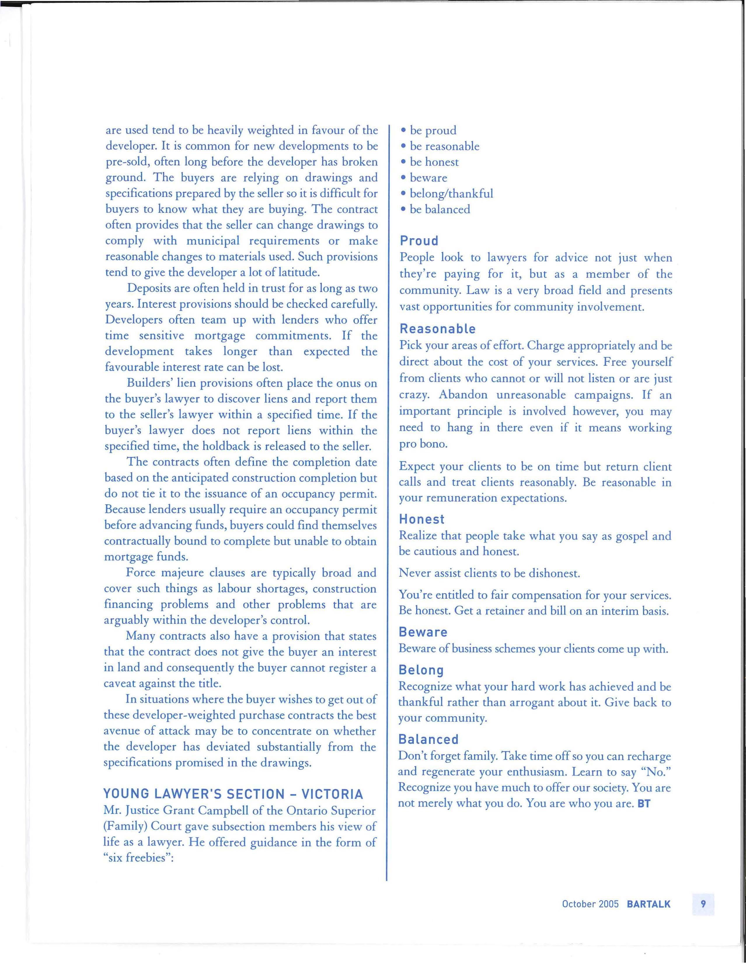 This report is an important document, not only for the CBA but also for the profession as a whole. At 65 pages it is a relatively easy read and contains a w ealth of information. It can be found at www.cba.org/futures. I commend it to you BT