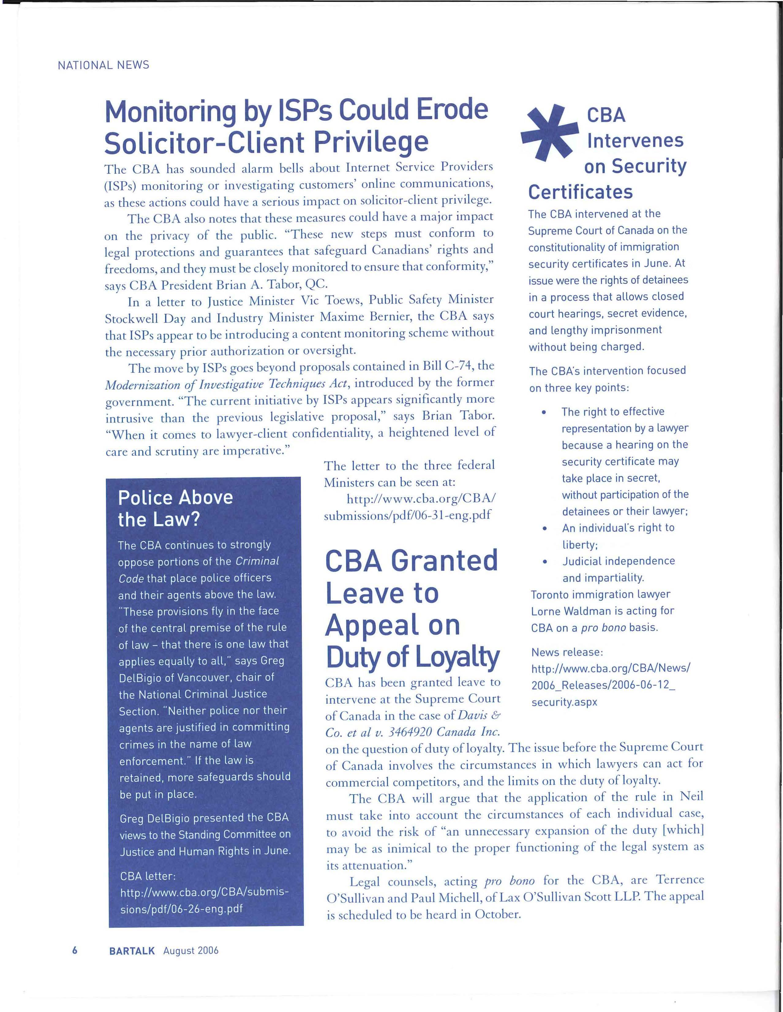 T h e ri g ht t o so li c itor - cli e n t pr iv il ege is a f und ame n ta l tenet of o ur ju st ice sys tem a n d th e CBA w ill a l ways r e m a i n v ig il a nt in o ur p r otect io n of t h at ri g h t. To r ead m o r e a bo u t th is imp orta n t iss u e, go to www.cba.o r g BT