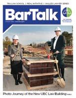 There seems to be a lot of construction going on. Two new buildings are being built to accommodate law students: UBC Faculty of Law (pp. 1-2) and Thompson Rivers University Law School's new House of Learning, (p. 12), both of which should open in 2011. a welcome opportunity to focus this issue on Legal education: read, for example, how the ReAL initiative has successfully linked students and lawyers throughout small communities and rural areas in B.C. (p. 13). If you have topics or themes that you would like to discuss or read about in BarTalk, please let us know (bartalk@bccba.org).