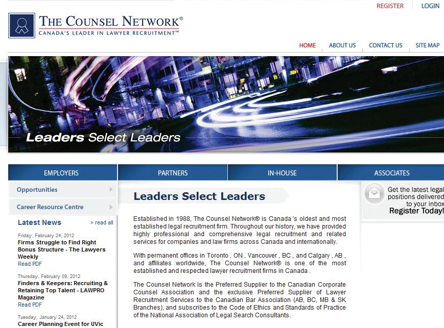 \ While traditional legal recruiters such as ZSA www.zsa.ca/zsa. php and Counsel Network www.thecounselnetwork.com are more about traditional