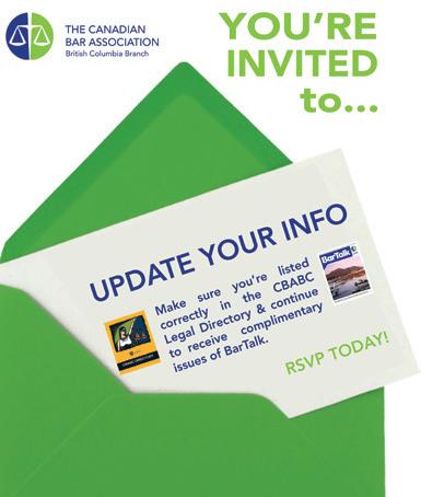 SPACE IS AT A PREMIUM AND AVAILABLE ON A FIRST-COME FIRST-SERVED BASIS SO SEND YOUR BAR MOVE (MAX. 30 WORDS) AND A HIGH-RESOLUTION PHOTO TO CBA@CBABC.ORG NOW.