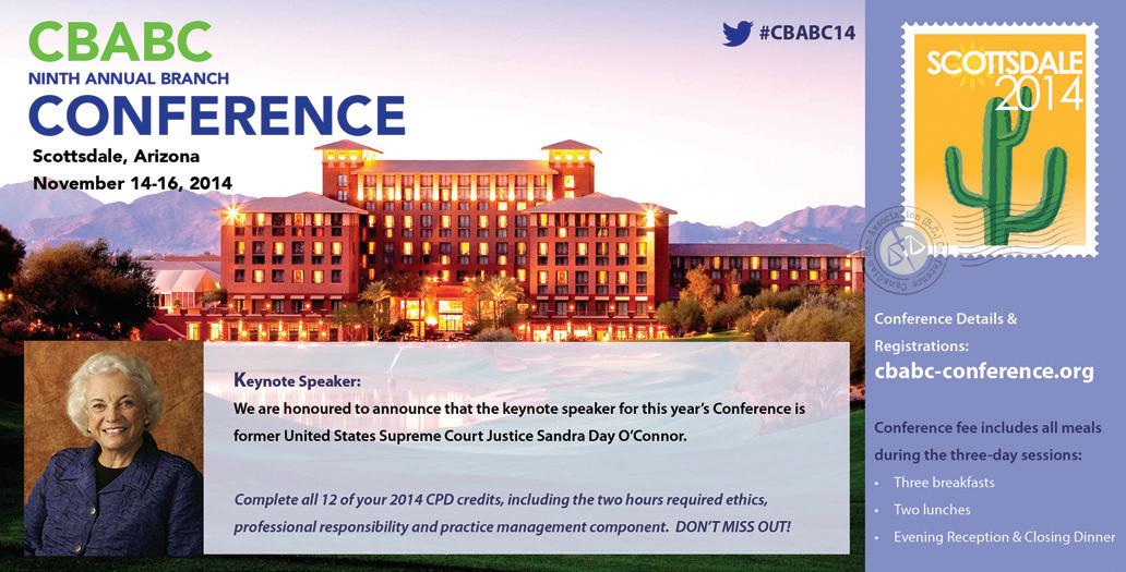 ADVOCACY, LAW REFORM, COMPOSITION OF THE JUDICIARY AND RADICAL CHANGE TO OUR SECTIONS –THIS YEAR HAD IT ALL. Ask the nearly 7,000 members in BC what they value in their CBA membership and the answers will vary greatly. Meeting the varied needs and interests of our members must be at the forefront of the CBABC’s activities year-round. As the 20132014 year draws to a close, I thought it appropriate to highlight some of the year’s events and where we are headed in the months to come.
