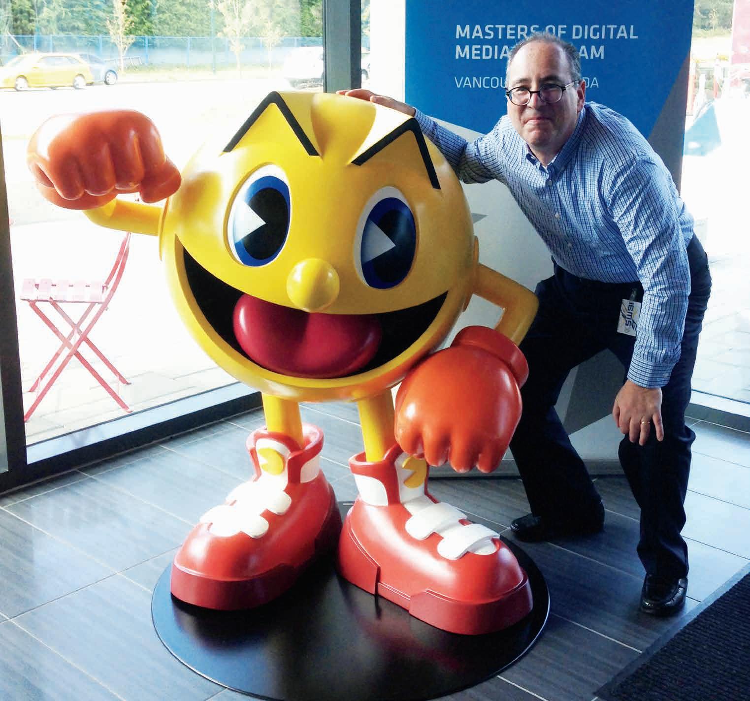 Cover photo: Jon Festinger, QC is standing next to the iconic Pac-Man character in the lobby of the Centre for Digital Media in Vancouver.