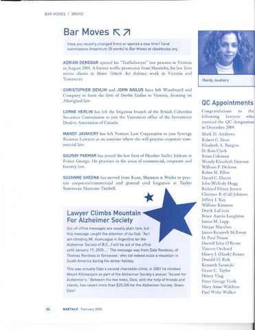 Lawyer Climbs Mountain For Alzheimer Society Out-of-office messages are usually plain fare, but this message caught the attention of BarTalk: "As I am climbing Mt. Aconcagua in Argentina for the Alzheimer Society of B.C., I will be out of the office unt il January 17, 2005 ...... The message was from Dale Rondeau, of Thomas Rondeau in Vancouver, who did indeed scale a mountain in South America during his winter holiday. This was actually Dale's second charitable climb; in 2001 he climbed Mount Kilimanjaro as part of the Alzheimer Society's annual "Ascent for Alzheimer's." Between the two treks, Dale, with the help of friends and clients, has raised more than $25,000 for the Alzheimer Society. Bravo Dale!
