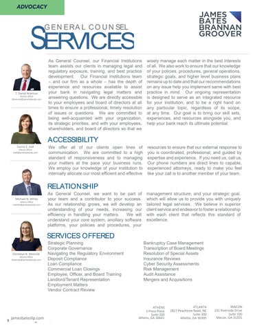CBA’s Advocacy Update is published weekly during the session and provides a recap of the week’s events as well as bills CBA is tracking. Georgia’s community banks are well represented with CBA’s Lori Godfrey, EVP, Government & Regulatory Relations, lobbying on their behalf. To subscribe, email cba@ cbaofga.com.