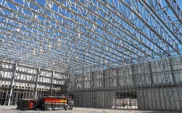 Vigas e pilares treliçados fabricados com perfis leves de aço fazem o intertravamento das estruturas para assegurar resistência às cargas horizontais
