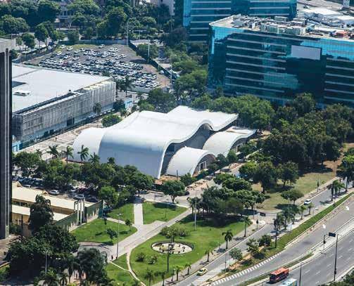 TanTo no Brasil como no exTerior, há inúmeras obras que derrubam o mito de que um sistema construtivo industrializado possa gerar apenas formas padronizadas e pouco sofisticadas. A construção do Pavilhão da Cidade Olímpica, no Rio de Janeiro, é uma delas. Com fachada e cobertura que remetem aos traços do mestre Oscar Niemeyer, o edifício foi erguido em aço no centro da capital carioca, ao lado da Prefeitura Municipal, para abrigar as instalações do Rio Media Center (RMC) durante os Jogos Olímpicos e Paralímpicos deste ano. O centro, que conta com auditório multiuso e tem capacidade para até 300 pessoas, recebe coletivas de imprensa e comporta dois estúdios de TV e seis de rádio em seu interior. Também tem 130 estações de trabalho com Internet cabeada e wi-fi, além de sinal de satélite para transmissões ao vivo.