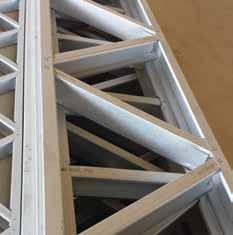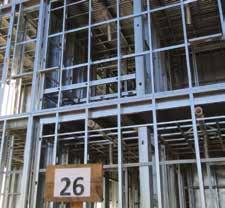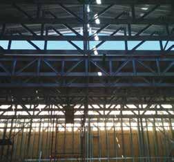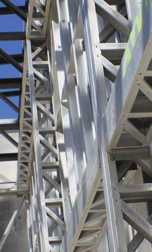 Para a realização das paredes, que chegam a 11 m de altura, uma solução de intertravamento se fez necessária para assegurar a resistência das estruturas ao vento forte do local. Foram construídas vigas treliçadas posicionadas a 4 m e 8 m de altura, e pilares também treliçados com 30 cm de espessura, instalados a cada 4 m ou 5 m, todos fabricados com perfis leves de aço. “Uma característica marcante desse projeto é que, apesar dos desafios estruturais, foi possível utilizar somente o light steel framing Não há nada de aço pesado”, revela a arquiteta Helena Rodrigues, gerente de projetos do Núcleo de Steel Frame do Gyp Group.