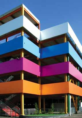 Com capacidade para 6 mil pessoas, o Centro de Convenções SulAmérica (acima) tem fachada curvilínea feita de painéis em aço com núcleo em EPS. Abaixo, fachada metálica transformou o edifício-garagem do shopping Paço Alfândega, no Recife, em um dos marcos arquitetônicos da cidade, e promove belo contraste entre o moderno e o antigo tura de aço, permitiu que a construção de uma nova área do estacionamento transcorresse sem prejudicar o funcionamento das lojas e a segurança do estabelecimento. Em pouco tempo, foi possível erguer o edifício de quatro pavimentos e quase 27 mil m2, que tem pilares e vigas de aço laminado e lajes em concreto. Para complementar o sistema construtivo foram adotados painéis de aço pré-pintado com núcleo em EPS, nas cores características do estabelecimento comercial, para os fechamentos laterais. “Precisávamos de algo que fosse de montagem rápida e não gerasse entulho”, afirma o engenheiro Bruno de Alvarenga Menezes, diretor de produção da Toctao Engenharia, responsável pela execução da obra. Para fixar os painéis na estrutura, bastava aparafusá-los. “A agilidade foi a grande vantagem acrescentada ao processo de construção”, afirma. (J.G.) M