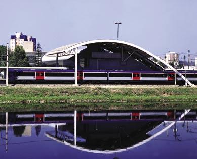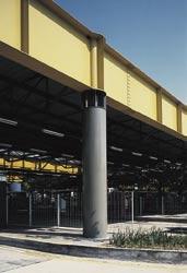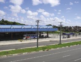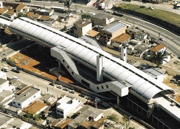 Acima, vista externa da estação Capão Redondo, onde se nota o contraste entre a dureza do concreto e a leveza do aço.