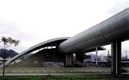 Uma passarela, com seção elíptica, faz a ligação entre o edifício de acesso e as escadas que levam à plataforma de embarque.