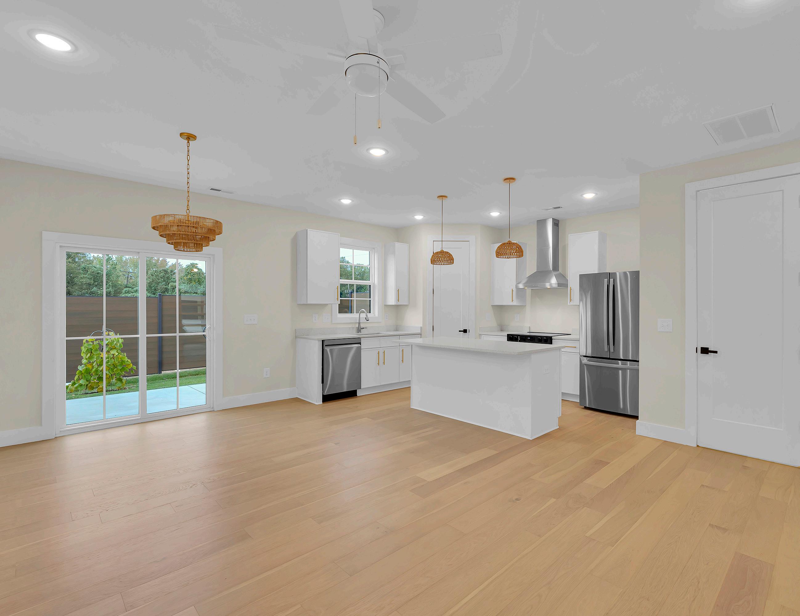 • Stainless steel appliances including smooth-top range, range hood, refrigerator and dishwasher. 42” upper cabinets