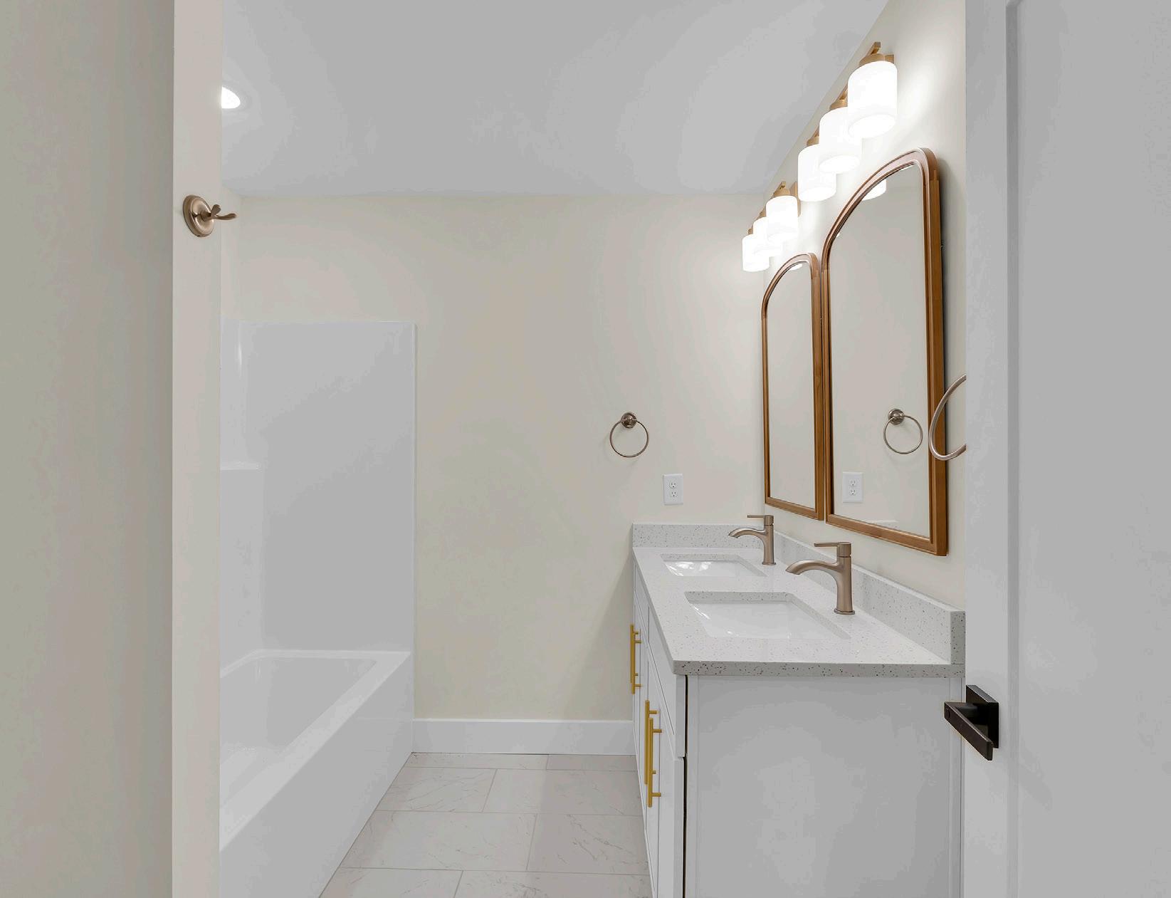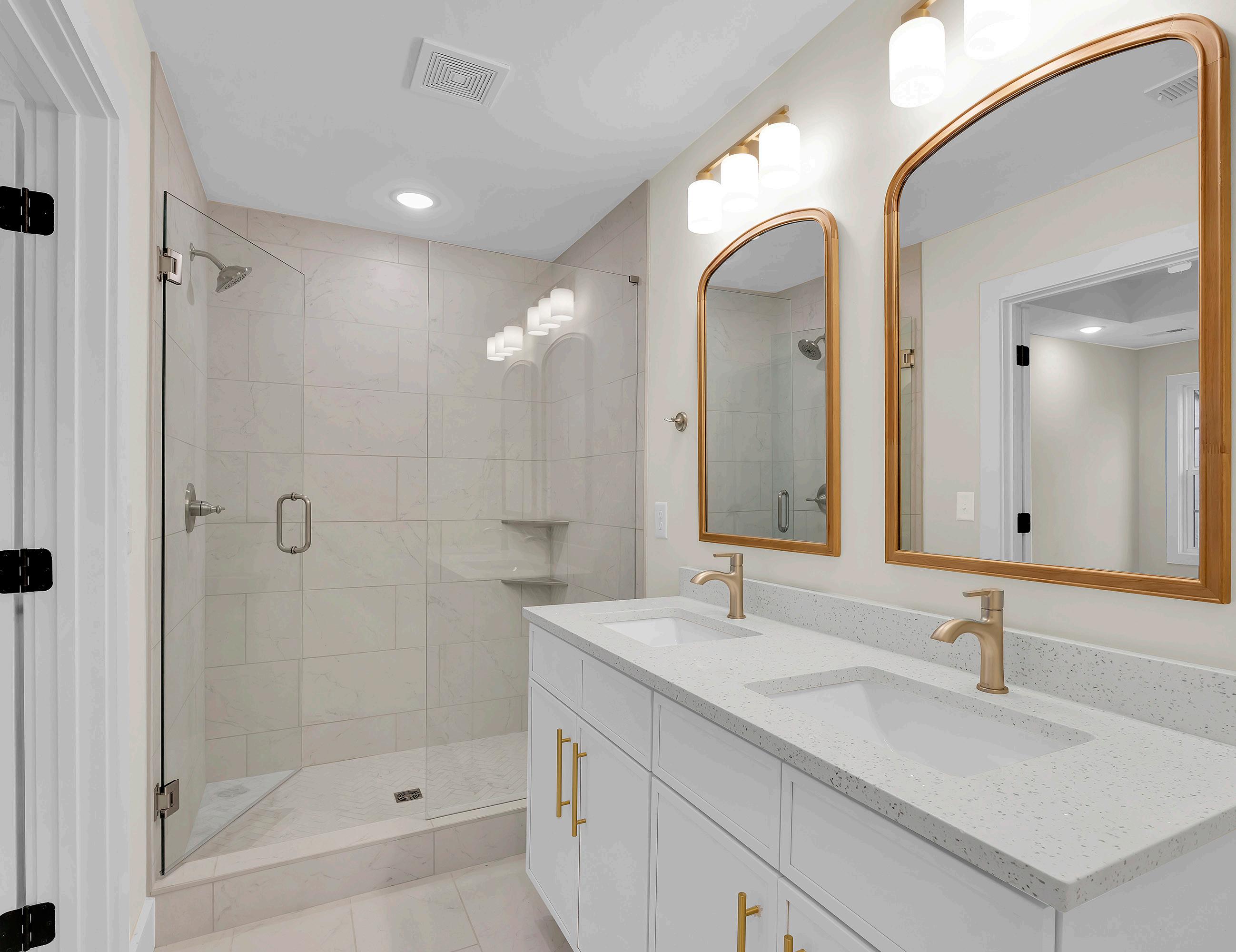 • Quartz counter tops with rectangular white sinks at all bathroom vanities