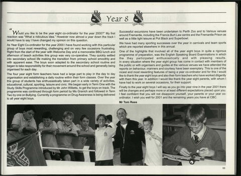 Successful excursions have been undertaken to Perth Zoo and to Various venues around Fremantle, including the Francis Burt Law centre and the Fremantle Prison as well as a little light leisure at Pot Black and Superbowl. We have had many sporting successes over the year in carnivals and team sports which are reported elsewhere in this annual. One of the highlights that involved all of the year eight boys in quite a rigorous programme of preparation, was the English Speaking Board Examinations in which the they participated enthusiastically and with pleasing results. In every situation where the year eight group has come in contact with members of the public or with organisers and guides at the various venues we have attended the reports on behaviour, manners and courtesy have been exemplary. Th is is one of the nicest and most rewarding features of being a year co-ordinator and for this I would like to thank the year eight boys and also their form teachers who have worked diligently with them this year. In addition I would like thank the year eight parents, with whom I have had to work on several occasions, for their support. Finally to the year eight boys I will say as you go into year nine in the year 2001 there will be changes and perhaps more or at least different expectations placed upon you . I feel confident that you will not disappoint yourself, your parents or your year coordinator. I wish you well for 2001 and the remaining years you have at CBC.