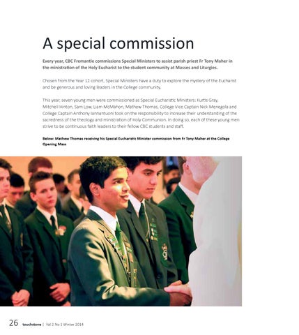 A special commission Every year, CBC Fremantle commissions Special Ministers to assist parish priest Fr Tony Maher in the ministration of the Holy Eucharist to the student community at Masses and Liturgies. Chosen from the Year 12 cohort, Special Ministers have a duty to explore the mystery of the Eucharist and be generous and loving leaders in the College community. This year, seven young men were commissioned as Special Eucharistic Ministers: Kurtis Gray, Mitchell Hinton, Sam Low, Liam McMahon, Mathew Thomas, College Vice Captain Nick Menegola and College Captain Anthony Iannantuoni took on the responsibility to increase their understanding of the sacredness of the theology and ministration of Holy Communion. In doing so, each of these young men strive to be continuous faith leaders to their fellow CBC students and staff. Below: Mathew Thomas receiving his Special Eucharistic Minister commission from Fr Tony Maher at the College Opening Mass