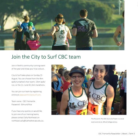Join the City to Surf CBC team Join in Perth’s community running event of the year and show your true colours. City to Surf takes place on Sunday 25 August. You can choose from the 4km walk/run/wheel chair event, 13km walk/ run, or the 21.1 and 42.2km marathons. You can join our team by registering online at www.perthcitytosurf.com. Team name: CBC Fremantle Password: Edmund Rice If you have any queries or would like to join one of our training teams, please contact Sally Northeast on northeast.sally@cathednet.wa.edu.au.
