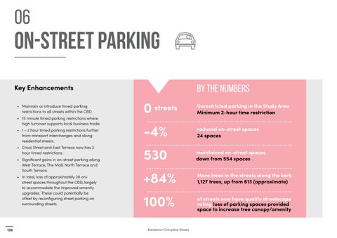 ON-STREET PARKING Key Enhancements • Maintain or introduce timed parking restrictions to all streets within the CBD. • 15 minute timed parking restrictions where high turnover supports local business trade. • 1 - 2 hour timed parking restrictions further from transport interchanges and along residential streets. • Cross Street and East Terrace now has 2 hour timed restrictions. • Significant gains in on-street parking along West Terrace, The Mall, North Terrace and South Terrace. • In total, loss of approximately 28 onstreet spaces throughout the CBD, largely to accommodate the improved amenity upgrades. These could potentially be offset by reconfiguring street parking on surrounding streets.